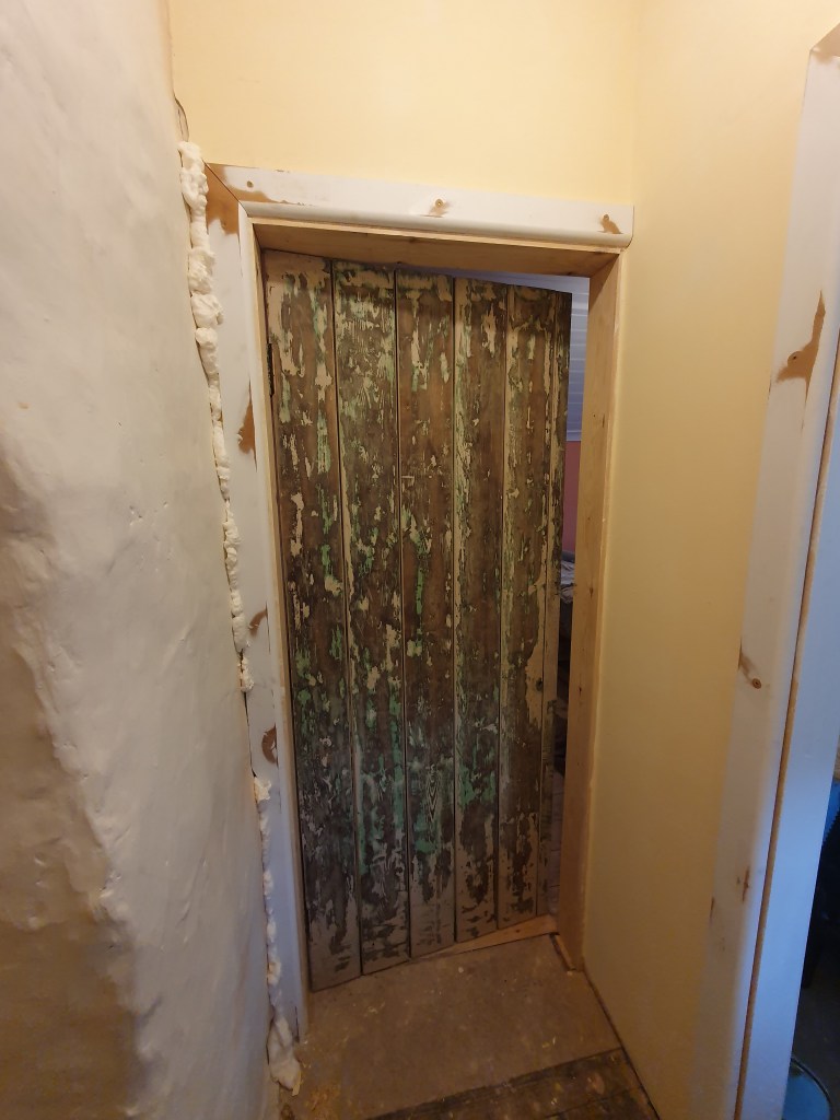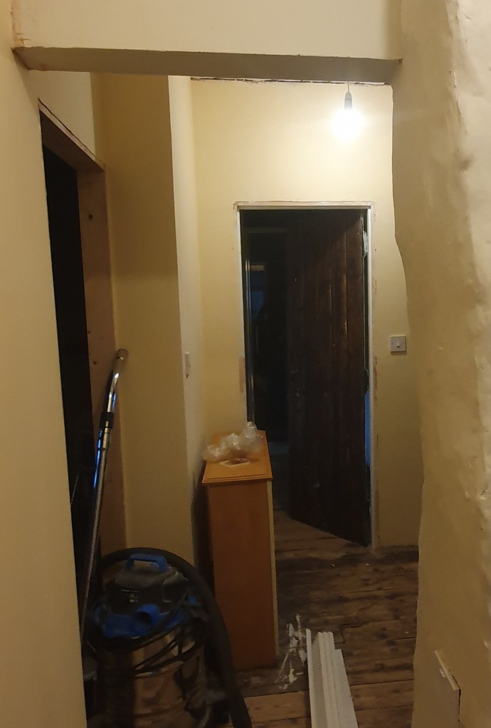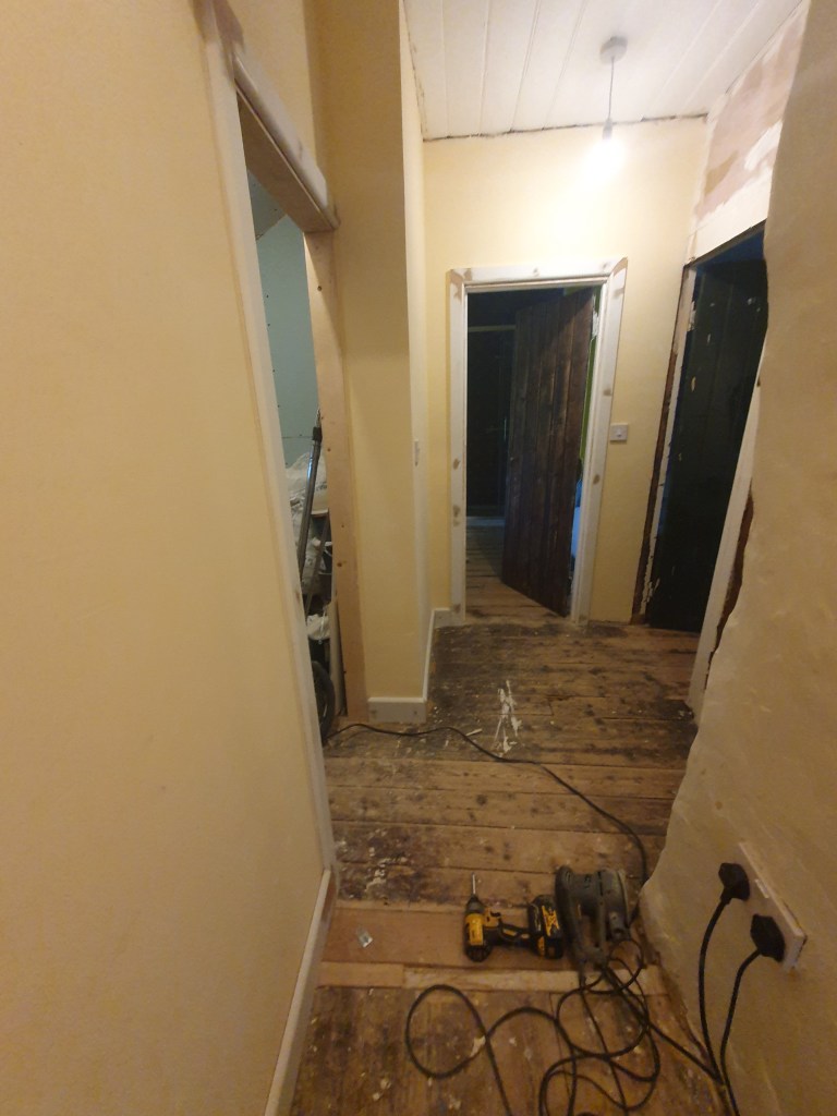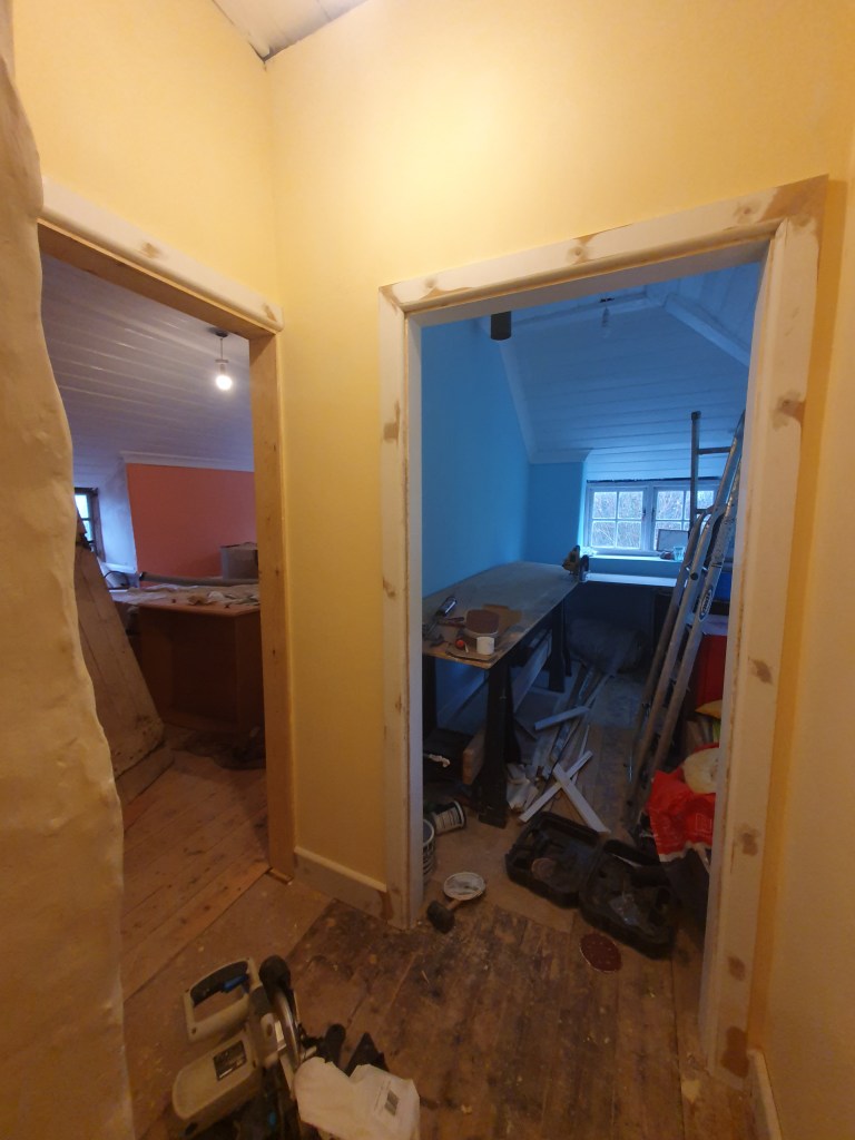 While I worked on the landing, Chris started on the skirting in the bedroom, however the skirting can’t be attached to the new plaster just yet.