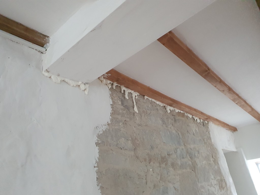 On the landing, and downstairs in the kitchen, we plugged some awkward gaps with expanding foam before cutting it back and using filler to smooth over the surface.