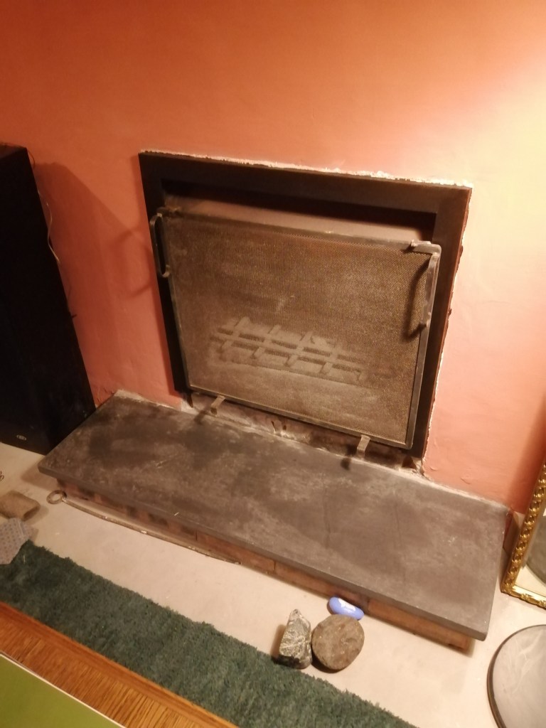 Next he cleaned and sealed the slate in front of the fireplace, and painted the surround with black metal paint. Long-term we will put in a log burner, but for now this tidys it up.