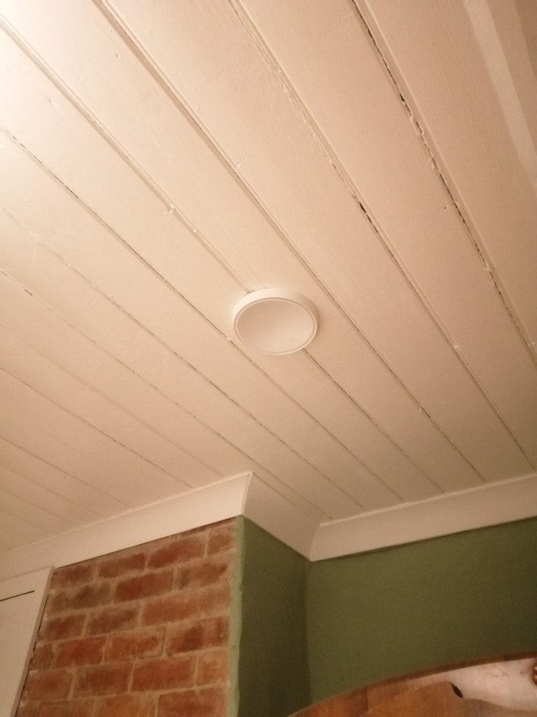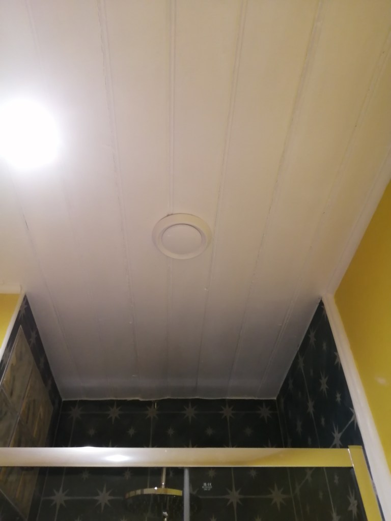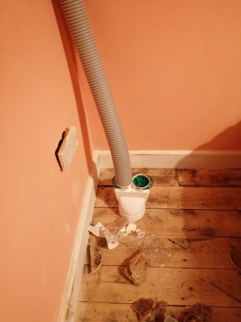 Firstly he put some finishing touches on the ventilation system, cutting down and connecting up the pipe in the spare bedroom, and cutting down the black tubes protruding from the ceiling in the bathroom and bedroom to attach the inlet and outlet caps. Sadly it wasn’t possible to put the pipe in the spare bedroom as close to the wall as we hoped, so rather than just boxing it in we may build a small cupboard around it to better use the space.