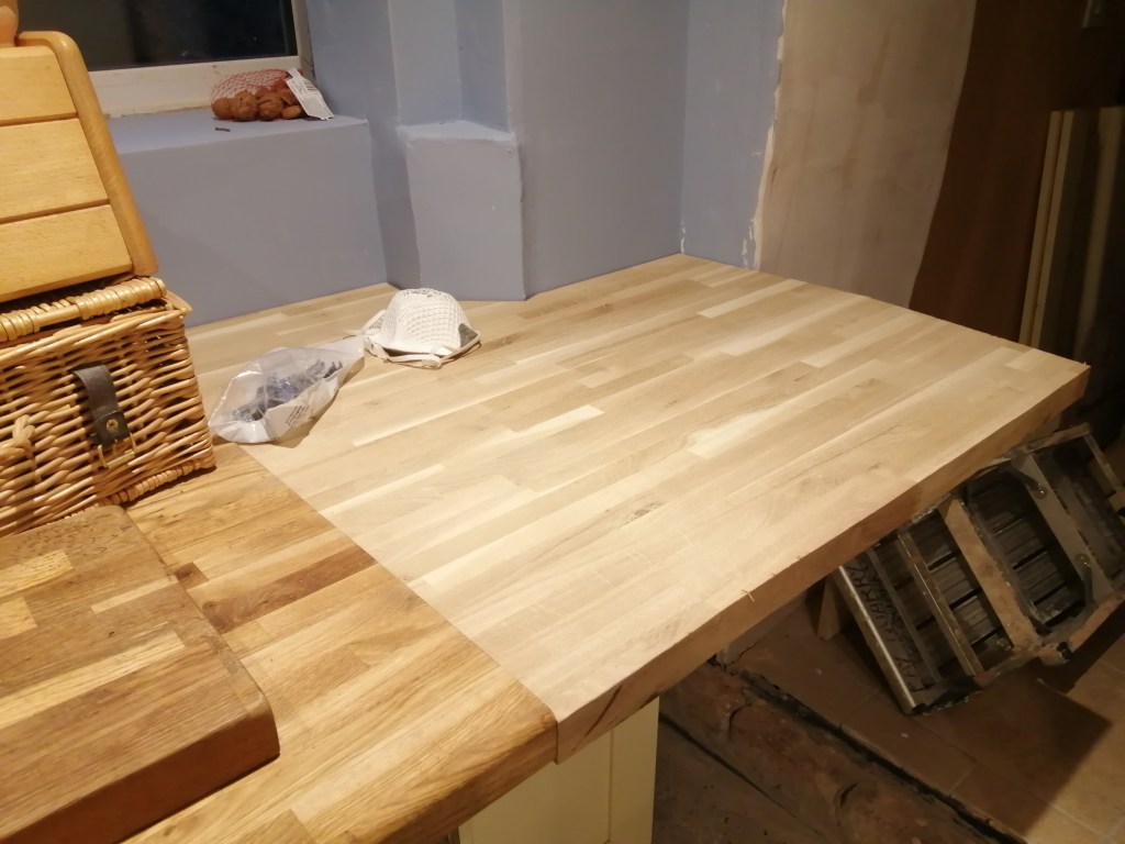While most of the worktop is in place, there’s one final awkward corner to do. Chris spent time cutting the back to fit, so now just the front needs shaping.