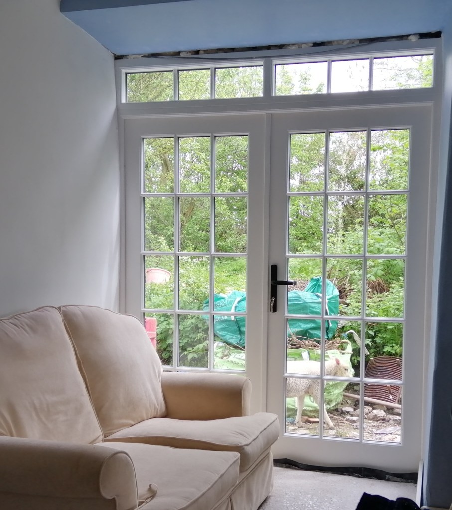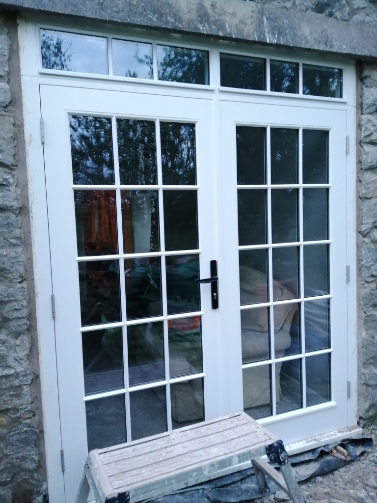 Outside, with the scaffolding taken down, the remaining first floor windows are too high for me to fill even on the ladder, so that’s Chris’s job. Instead I filled around the double door.