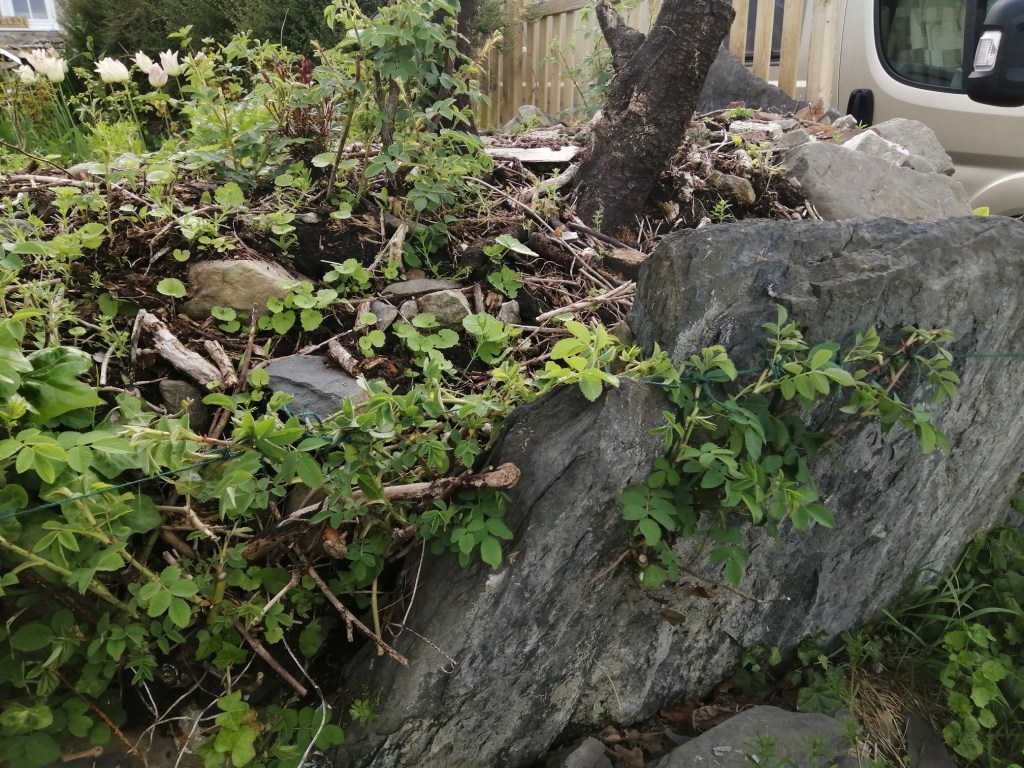 I started building a small single stone wall along the edge of the garden. Though much smaller than the walls I built in the front garden it’s slow progress as the stone aren’t as easy to get hold of – mostly buried in the garden. This will form the edge of the patio in time, and with a little work we can plant flowerbeds above them.