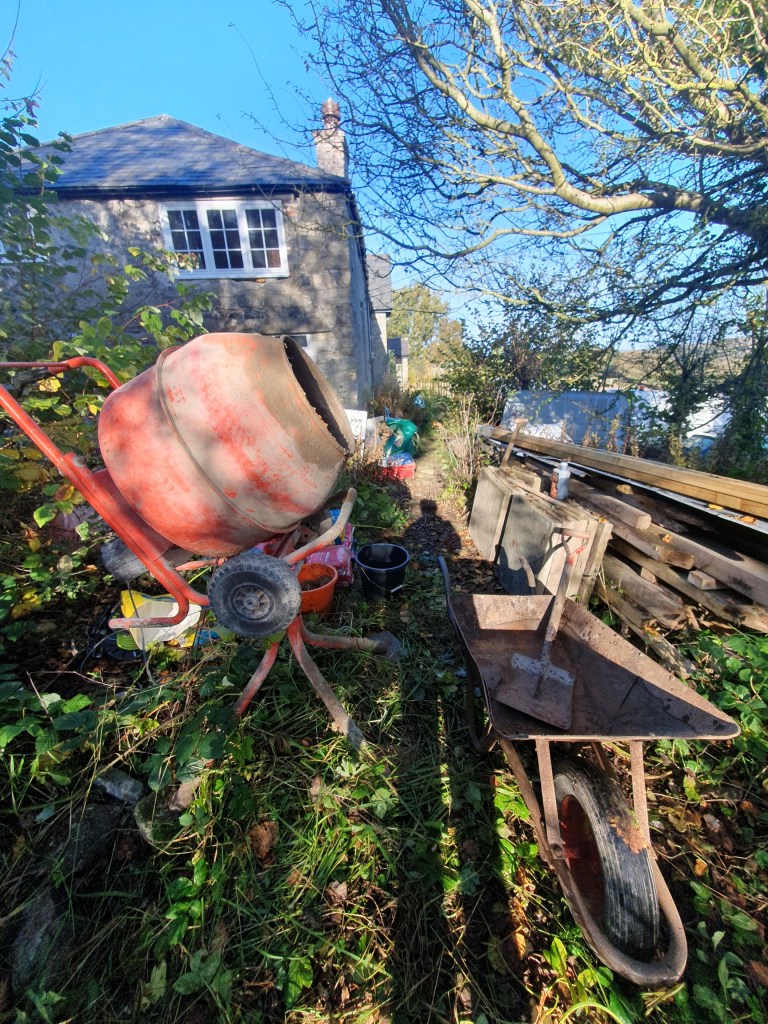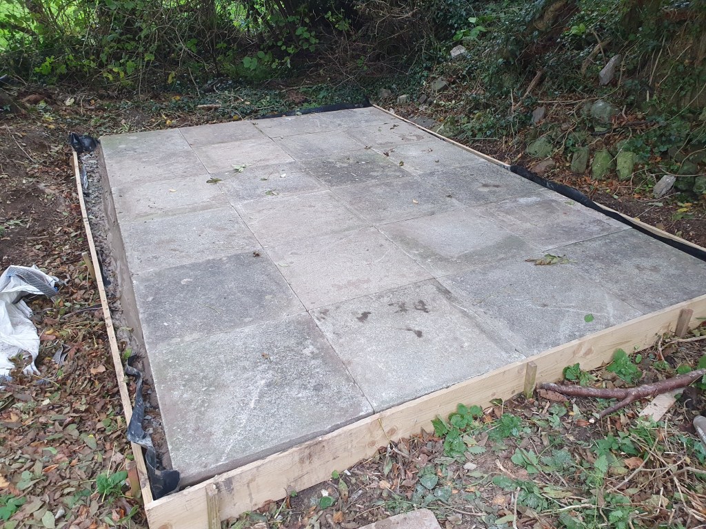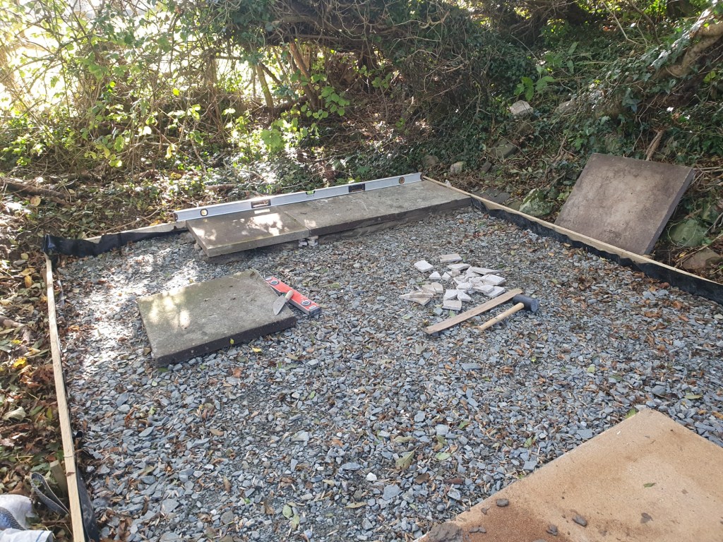 We borrowed Chris’s brother’s cement mixer and spent last weekend laying the concrete slabs for the base. As I can’t lift the slabs on my own, Chris laid the slabs while I wheelbarrowed sand from the drive to the cement mixer, and then wheelbarrowed cement to shed base, in a continuous loop for hours. For something that looks like such a small job it took a full day, and was pretty exhausting.