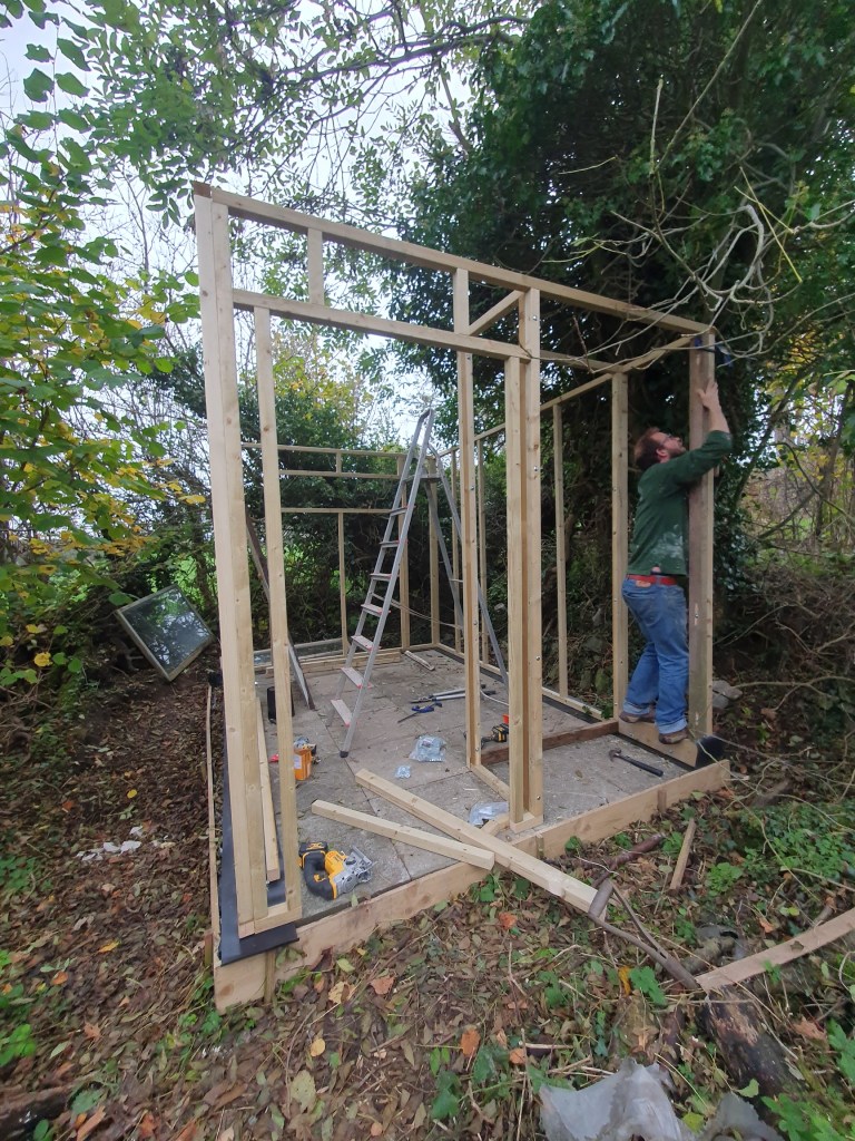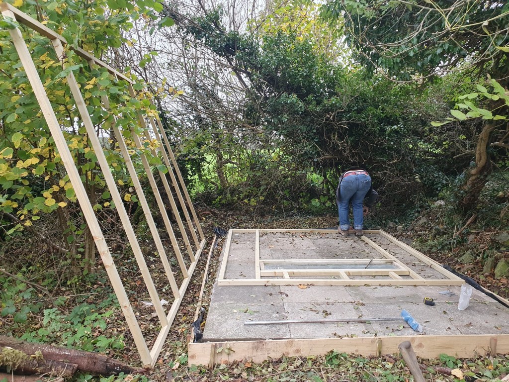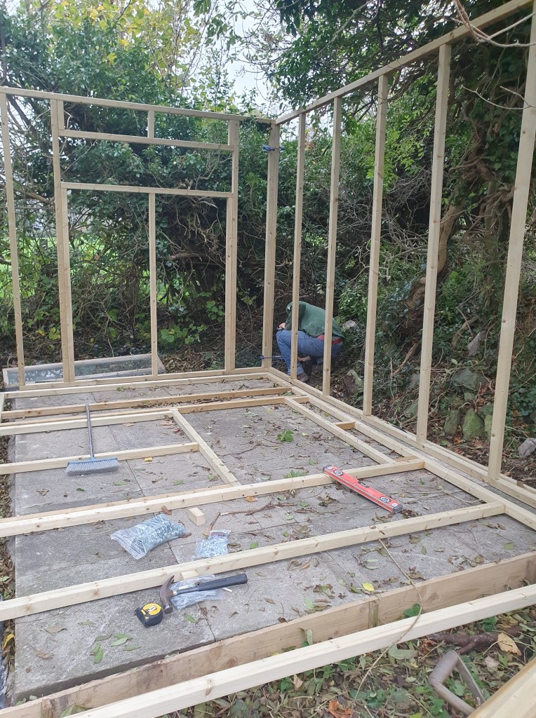 I spent my time cutting the wood to size while Chris hammered them together into frames. Once the frames were together we lifted them up and bolted them together. We then screwed the frame to the floor with a vapour membrane beneath it.