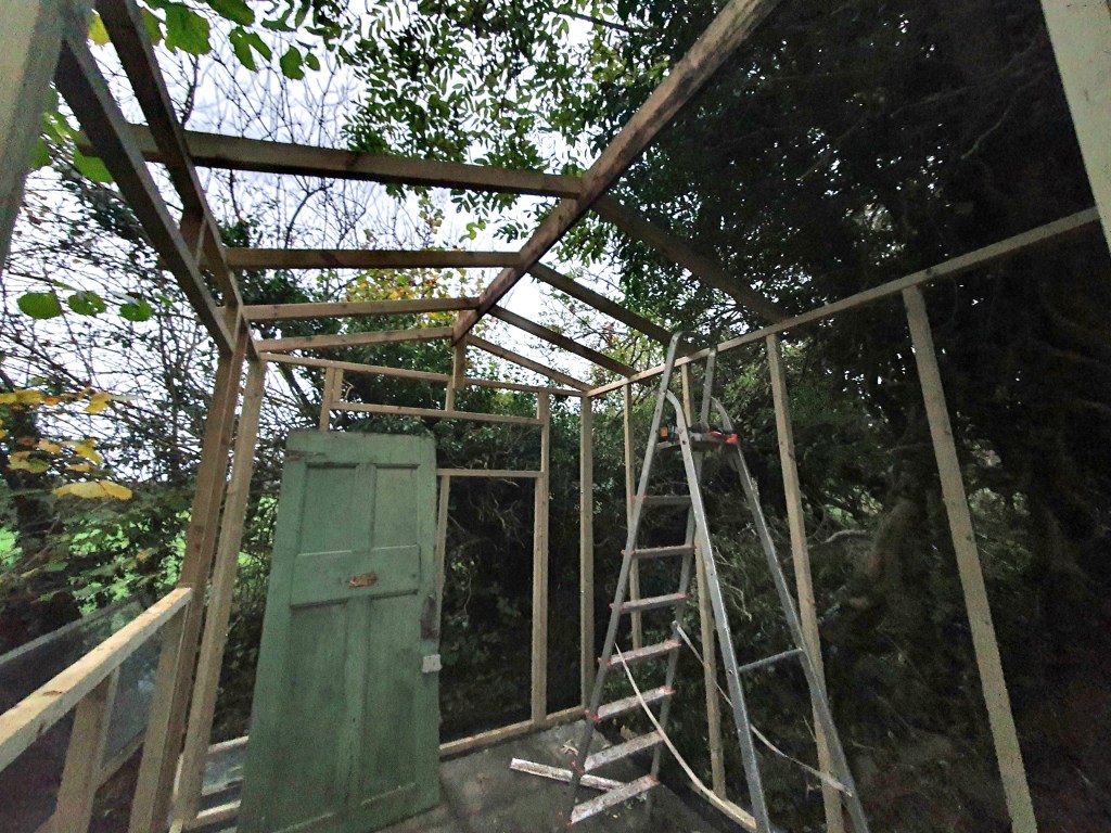 Chris has spent several evenings pondering on the design. He was keen to maximise the size so he could use it for tinkering on projects in the future. We also had an old door, two of our old windows, and some second-hand shelves that had to be worked into the design. My only inputs were a request for a green roof, an entrance for swallows, and an inbuilt bug hotel.