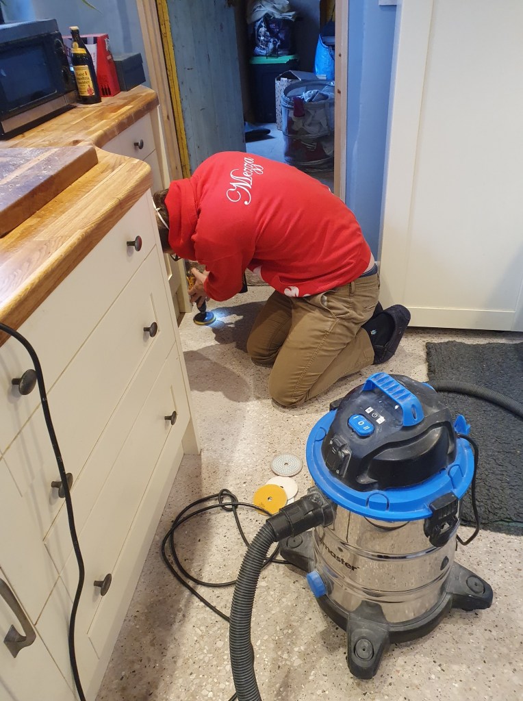 Before Chris headed off on holiday he decided to polish out some accidental stain marks on the concrete kitchen floor. They’d happened when he’d spilt wood stain from the worktop on the floor. Luckily they polished out fine.