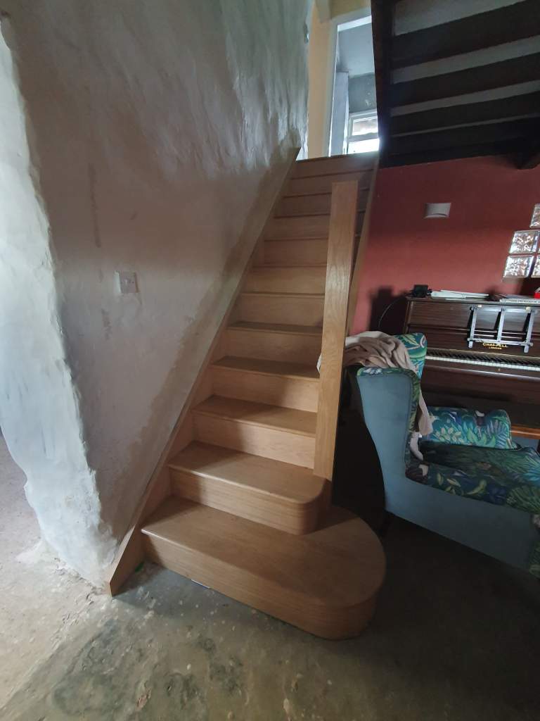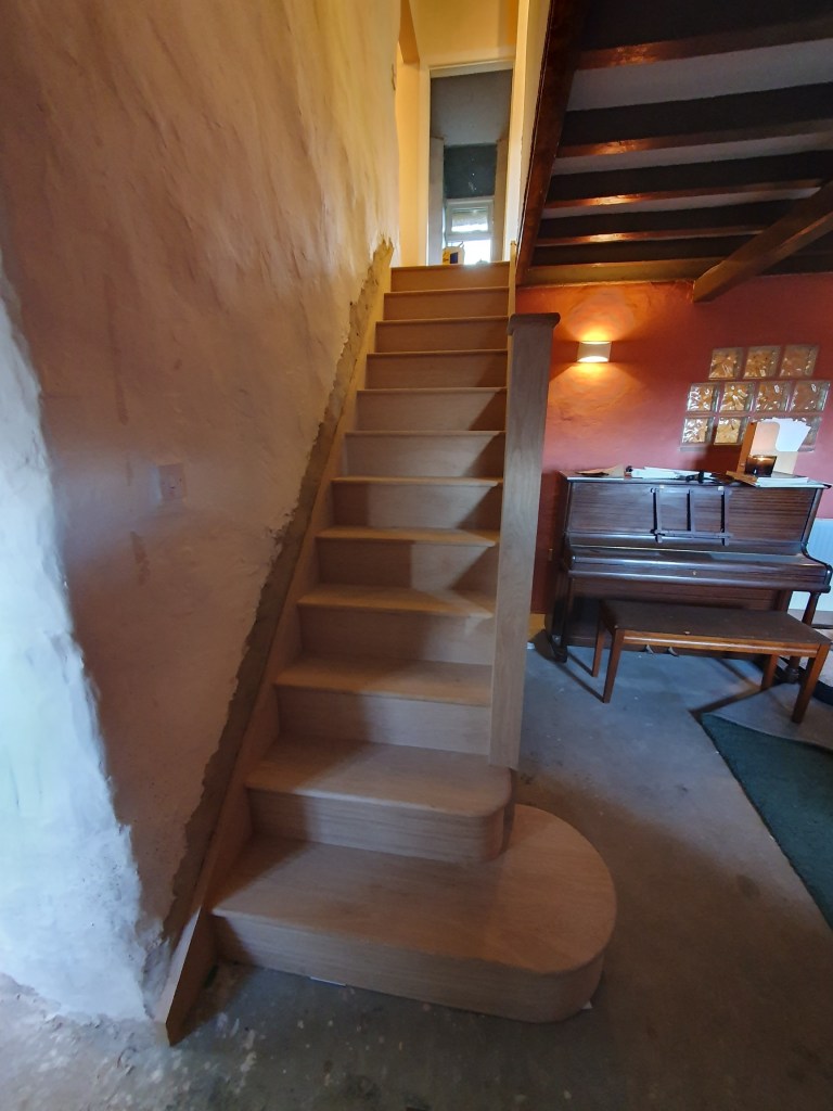 With an extra doggy guest arriving, we wanted to protect the stairs from damage by staining them. I did two coats, with a sand before and between. They are definitely much more protected now, if a little slippy for doggy paws. I also added the lime plaster coat on top of the rough plaster along the edge of the stairs. While I had the mix out I also plugged some gaps in the kitchen walls.