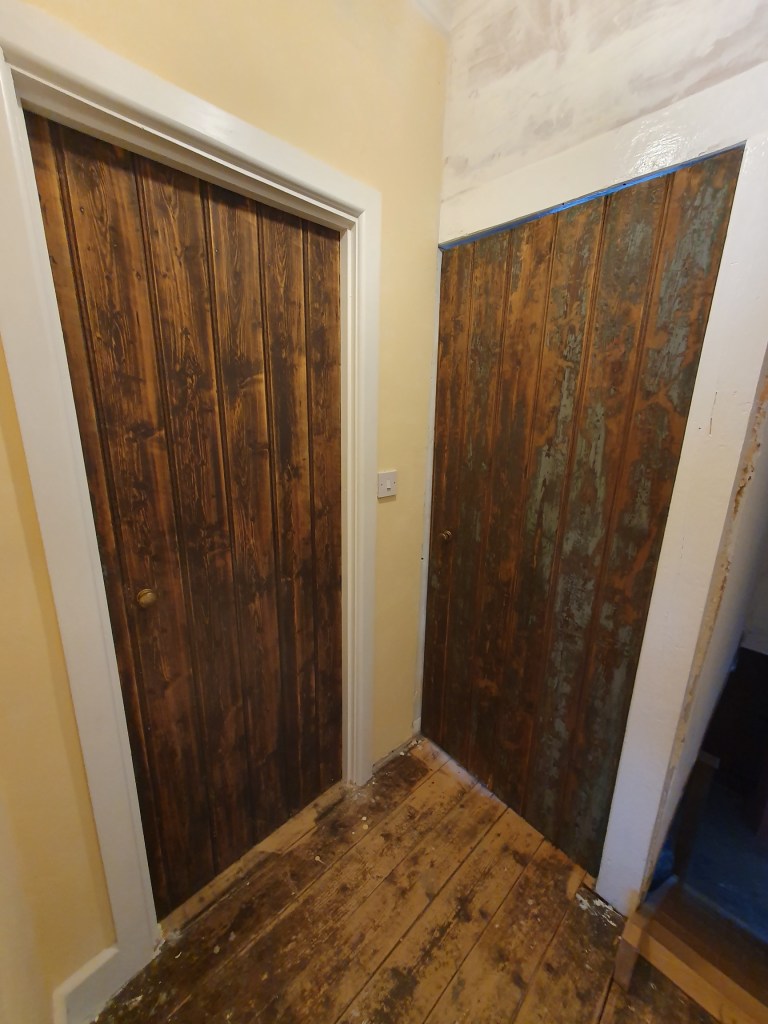 Having flipped our bedroom door to open the other way, I was now staring at the green side most nights, so as I’d done with the bathroom door I using paint stripper to take it back to the wood. Unfortunately, the paint stripper couldn’t quite get through all the paint layers, so I ended up hand sanding as well. But I’m happy with the end result.