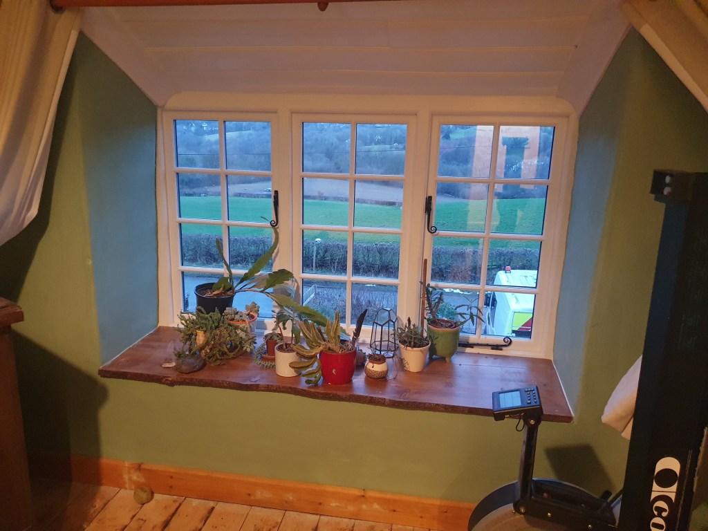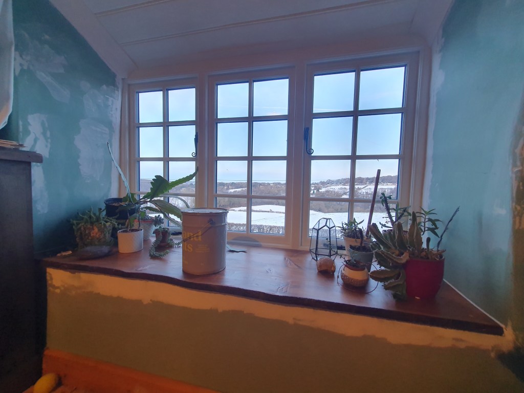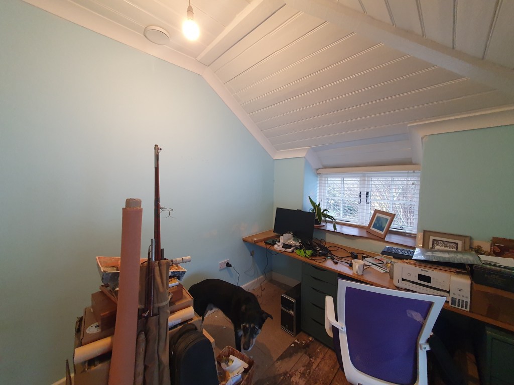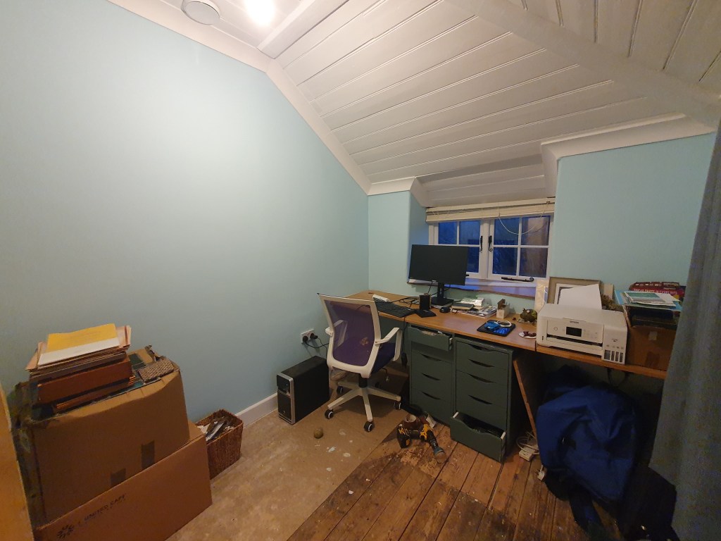 The second coat on the study/baby room wasn’t too bad except shifting around the various bits of bobs currently housed in there. Having filled and sanded under the windows, there were a few patches needing covering up, but mostly it looked the same post paint. Still very much worth doing before the carpet gets fitted.