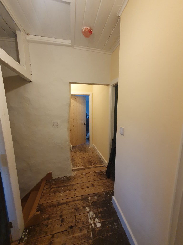 Though the pictures don’t really show the change the landing was a noticeable refresh. As we’re carpeting this area soon it made sense to repaint now, including a coat of yellow and repainting the stair wall post filling. There’s still the other side of the stairs to paint, but the wall is so high I’m not sure how we’ll reach the top.