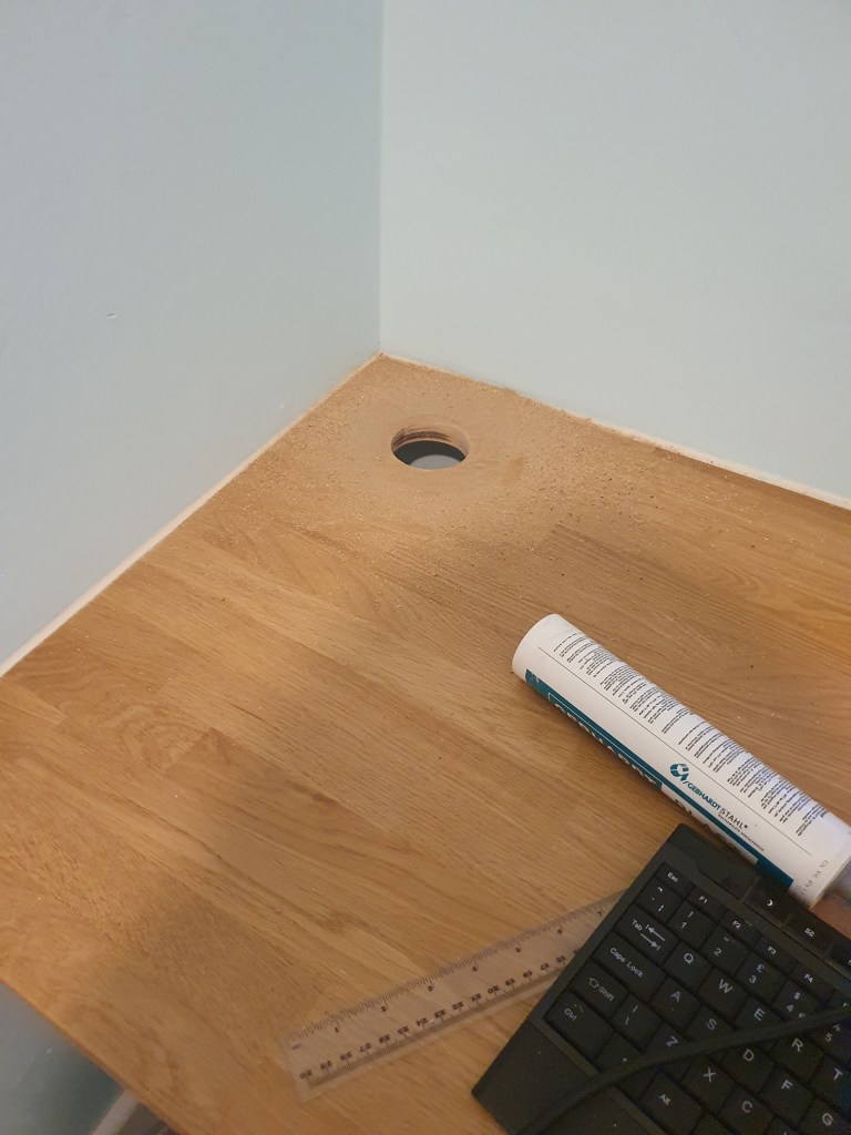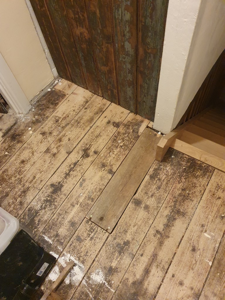 While I was busy painting, Chris got on with a few jobs that had been bothering him, including cutting holes through the desk for wires, and finally fitting an awkward bit of floorboard on the landing.