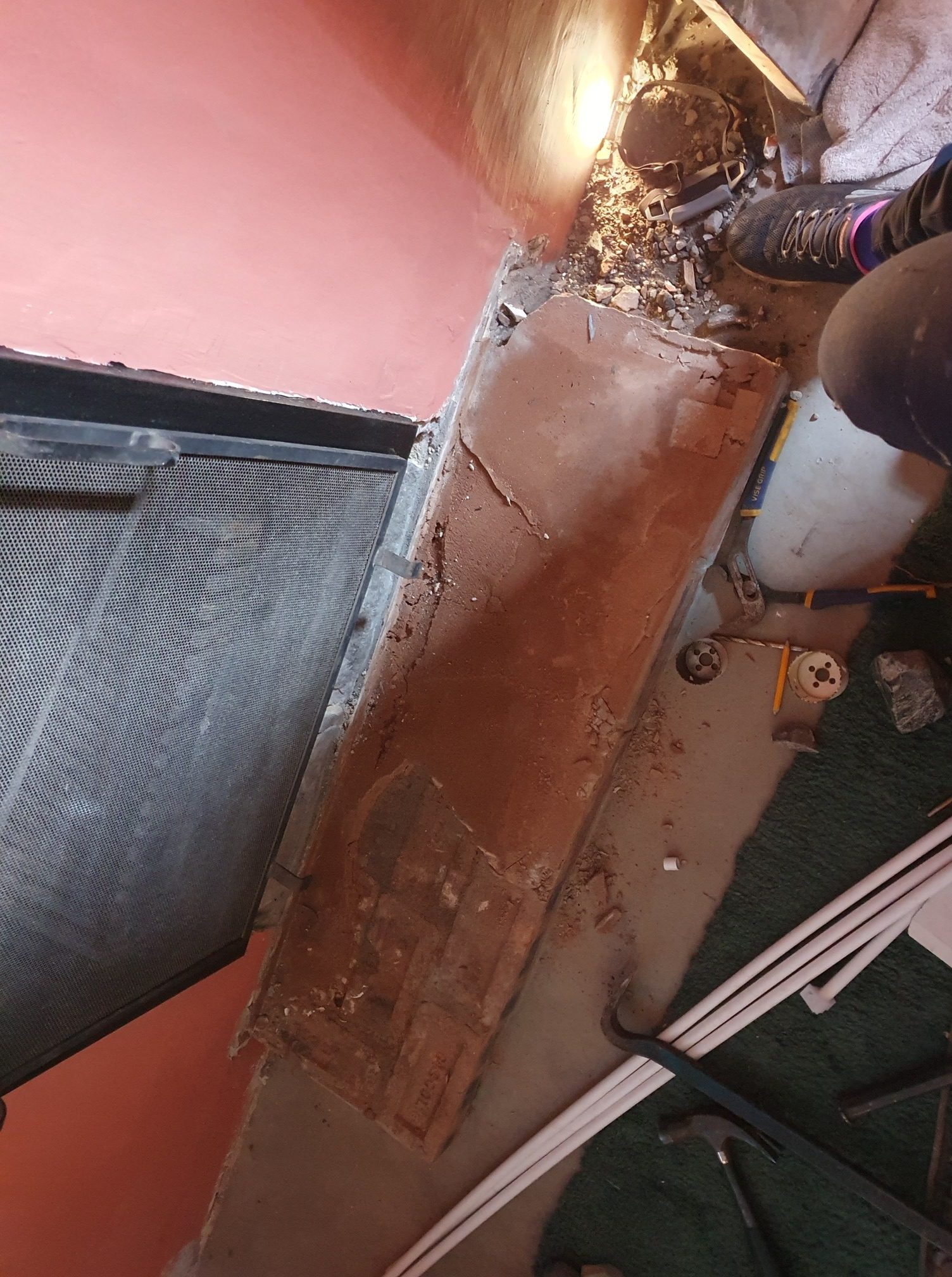The first job to achieve this was to lay the pipe. As the fireplace is in the way this meant creating a hole through the base and fitting the pipes through it. The remaining pipe I attached to loose skirting board, as this will allow us to raise it once the flooring goes in.