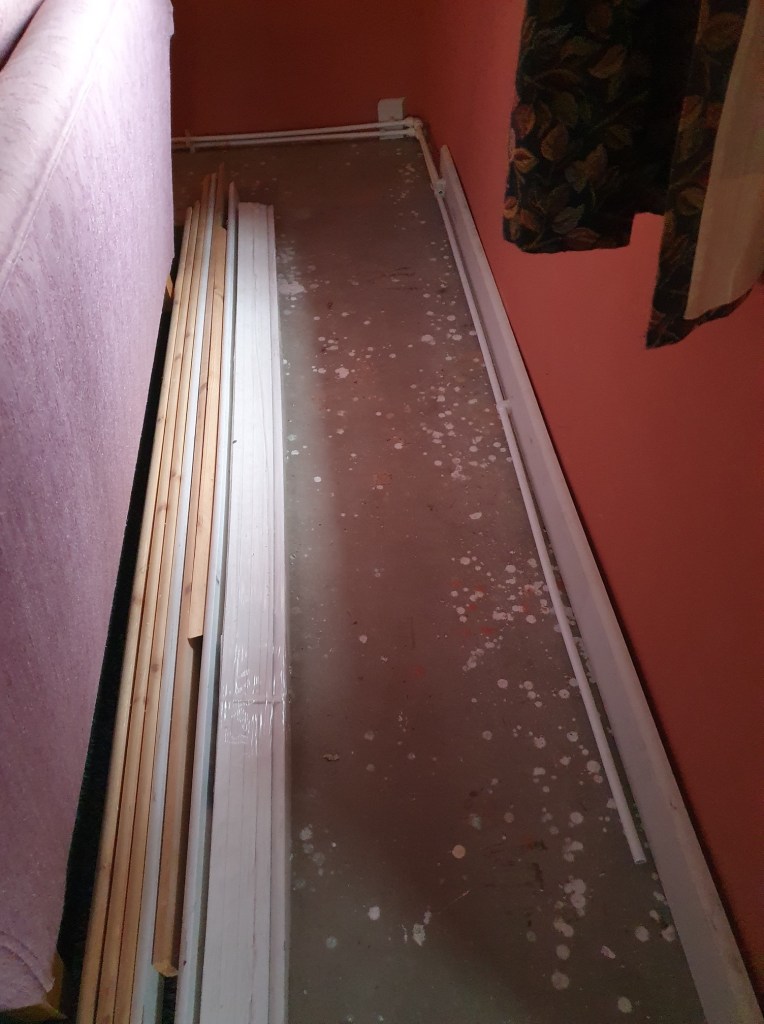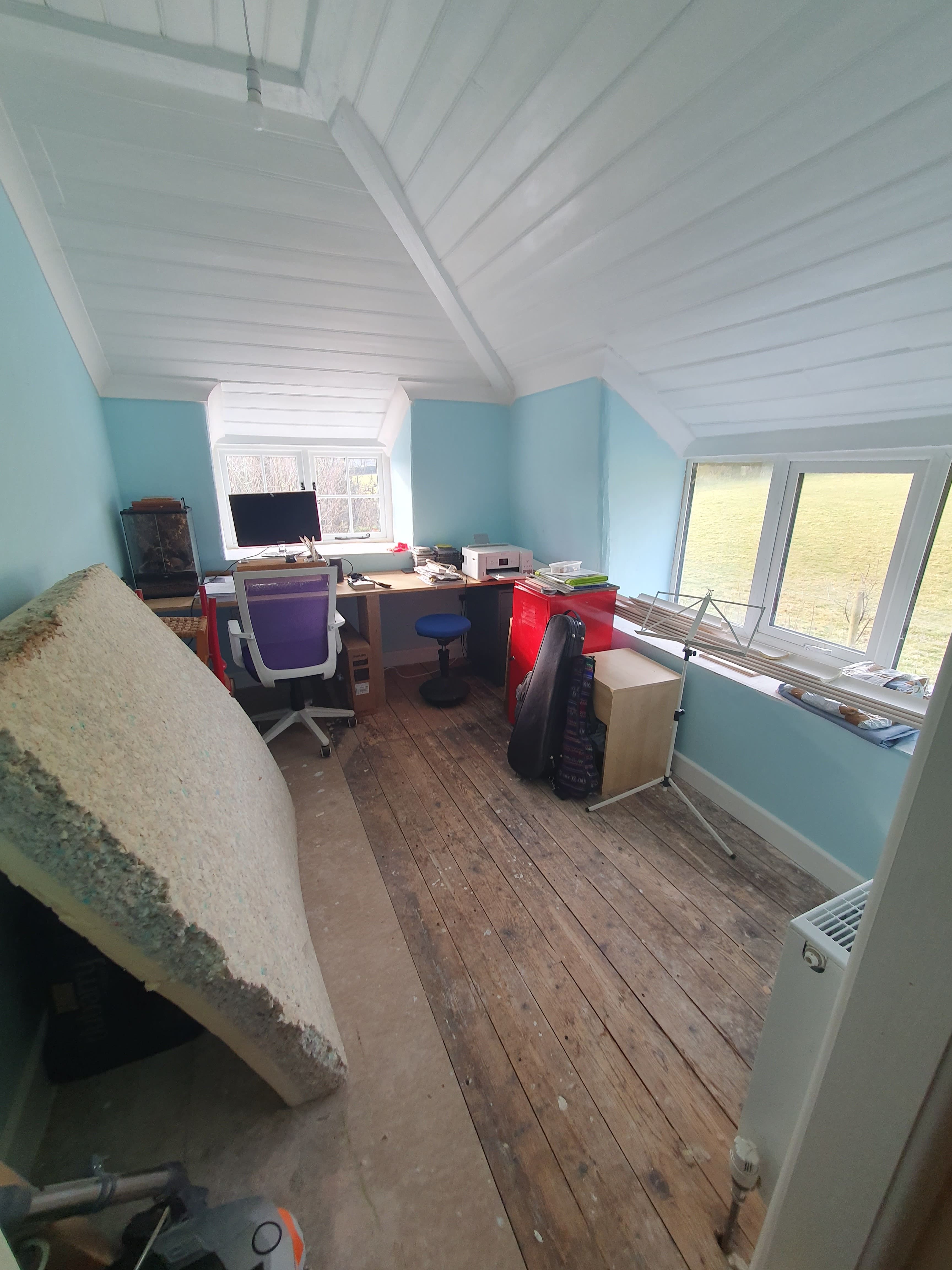With those bits tidied away I took DIY bits out to the shed, and took other bits and pieces to the recycling center. Finally, all that remains is a second hand mattress Chris bought to cut into beds for the dog, and a few pieces for the attic. But despite that we are now ready to get a carpet for this room, which will make it feel significantly more finished.