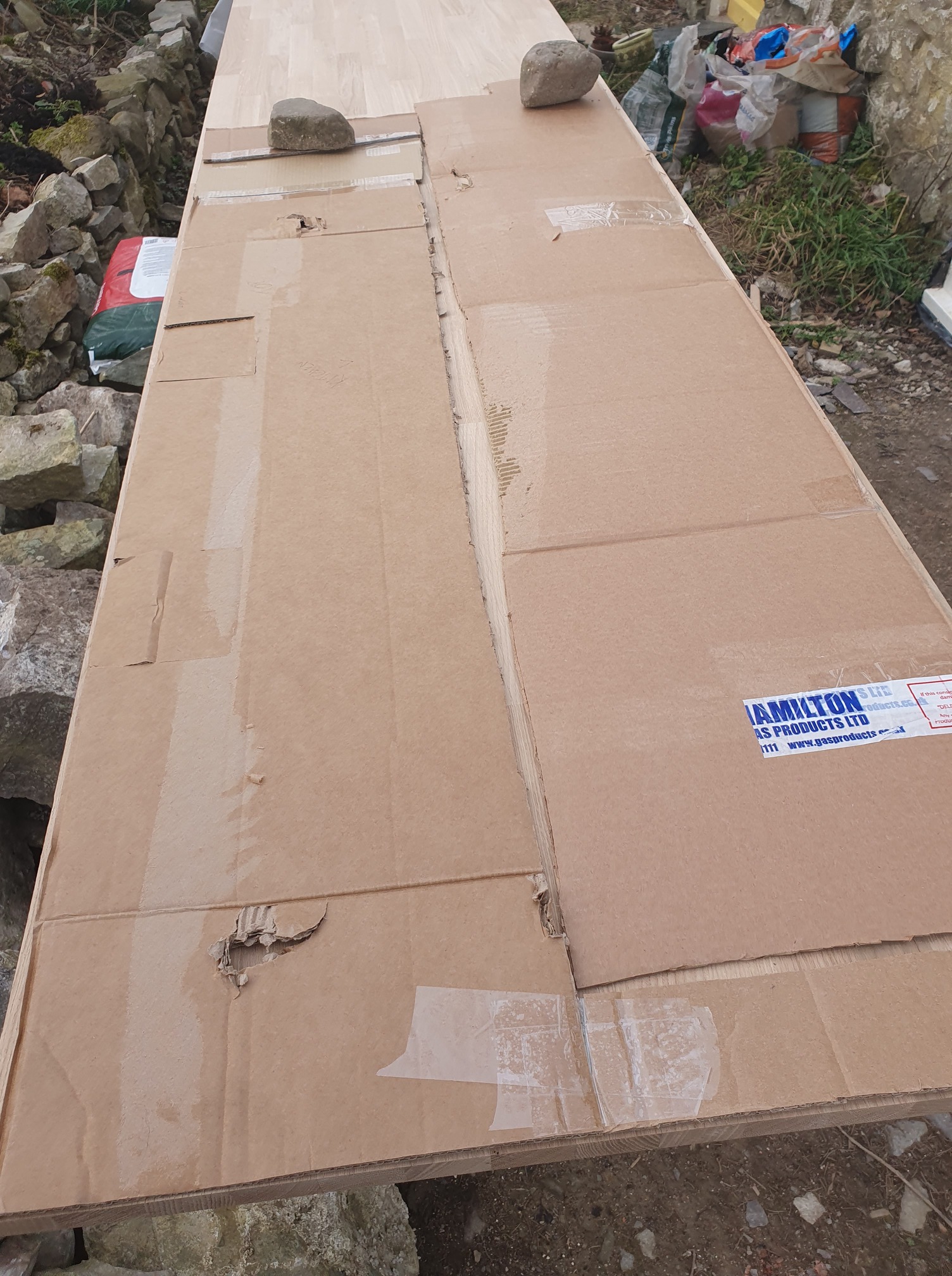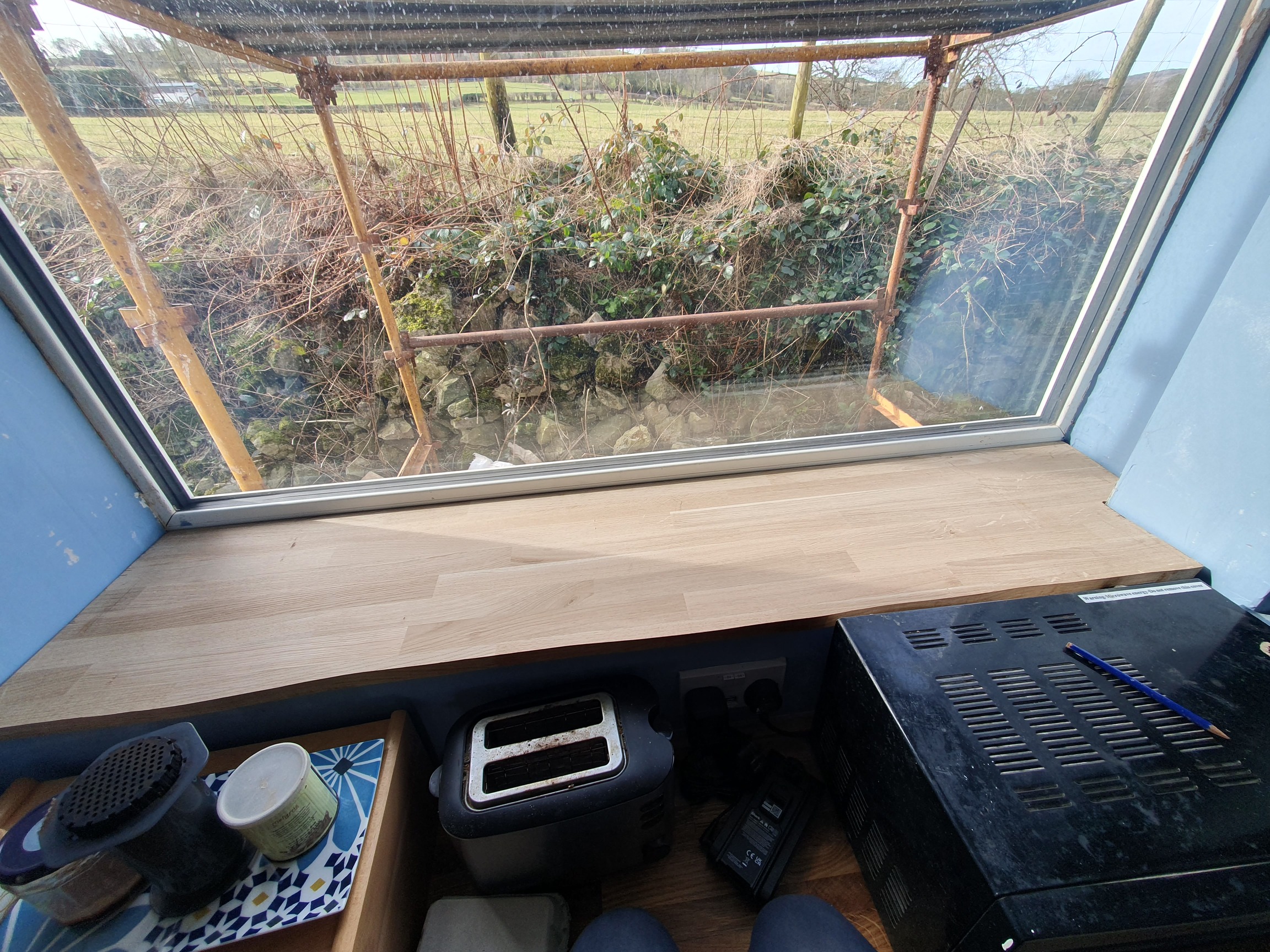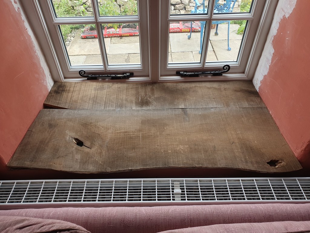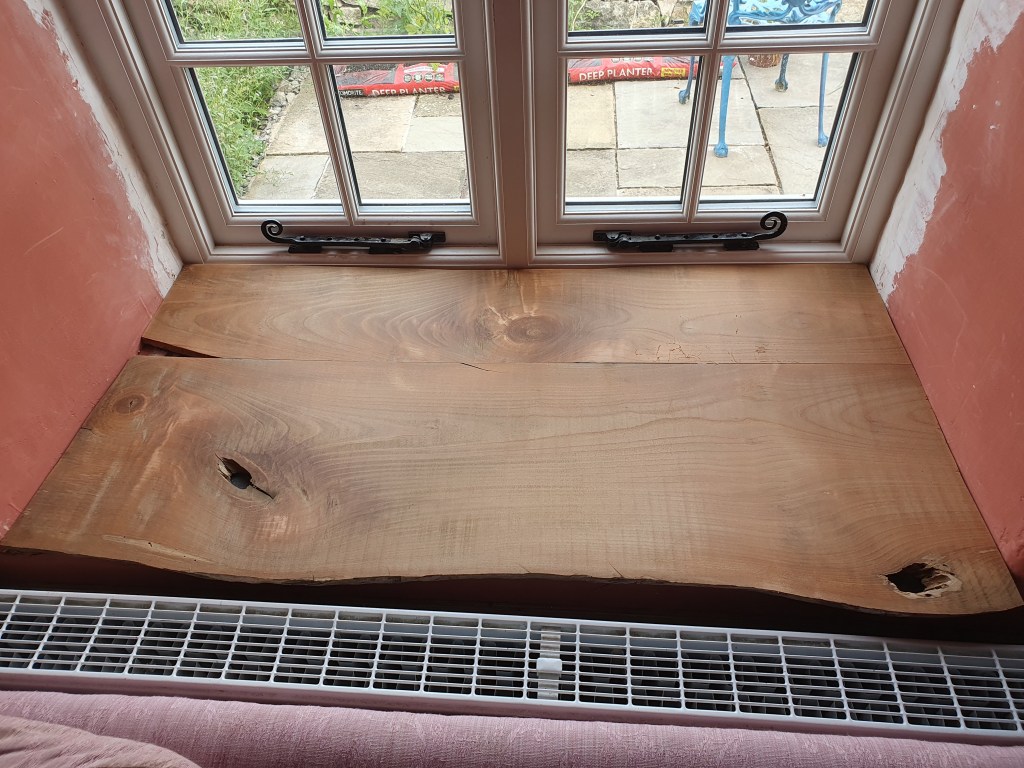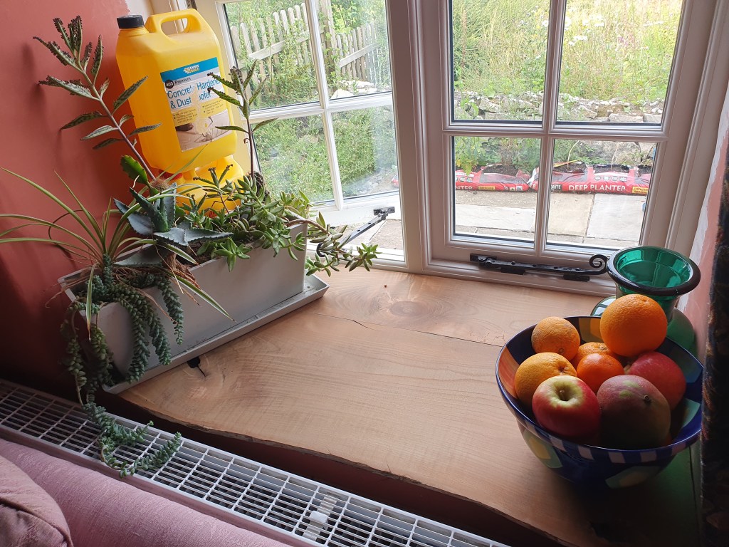 Having made templates for my windowsills, I got the chance to cut out the first two when a new piece of worktop arrived. Now they’re in place we just need to round the edges and stain. I’m itching to get onto the rest of the windowsills, but these are going to be made from elm planks and we first need to decide how to join the planks together.