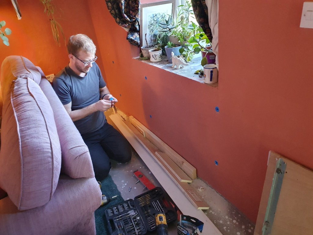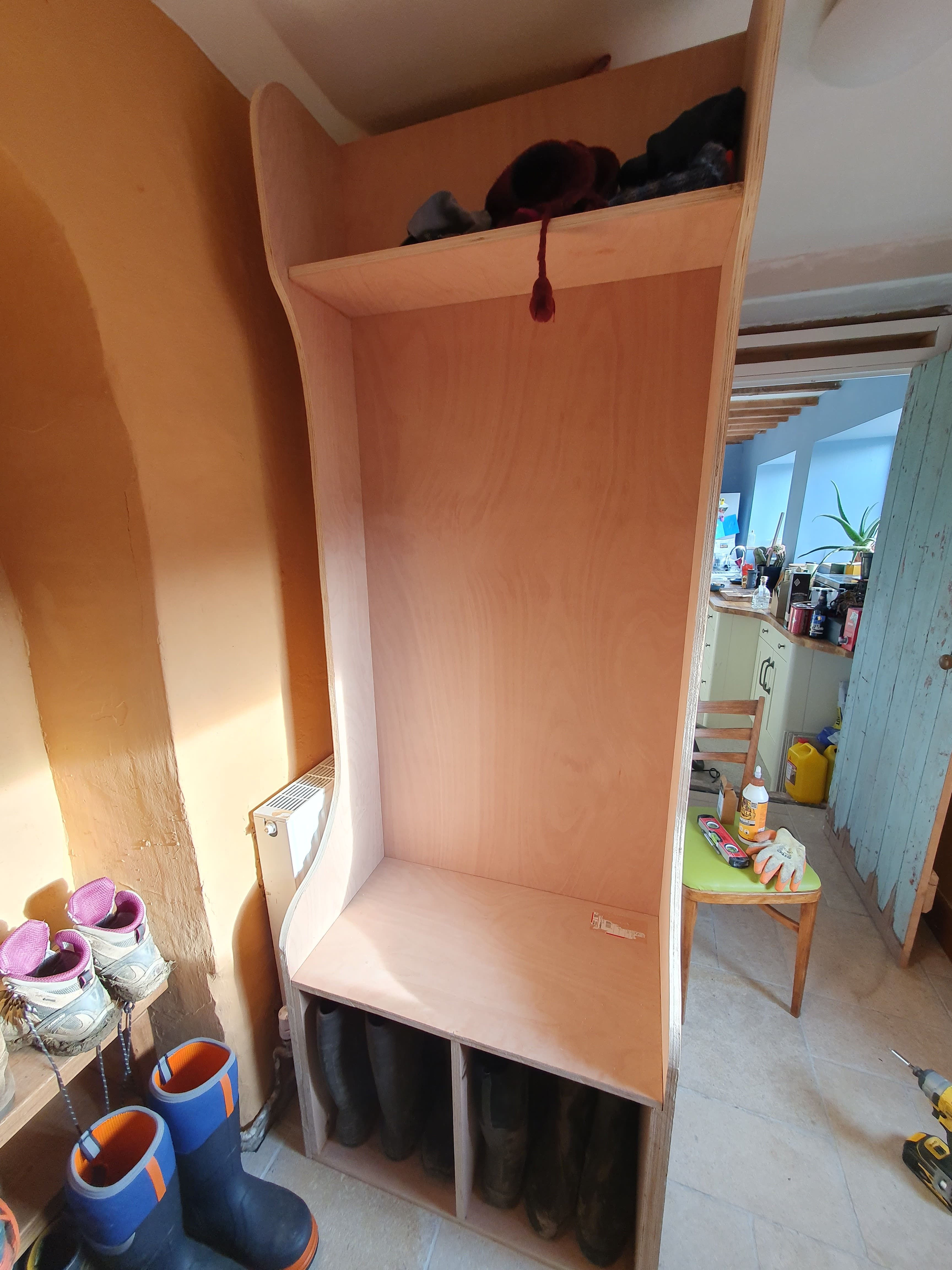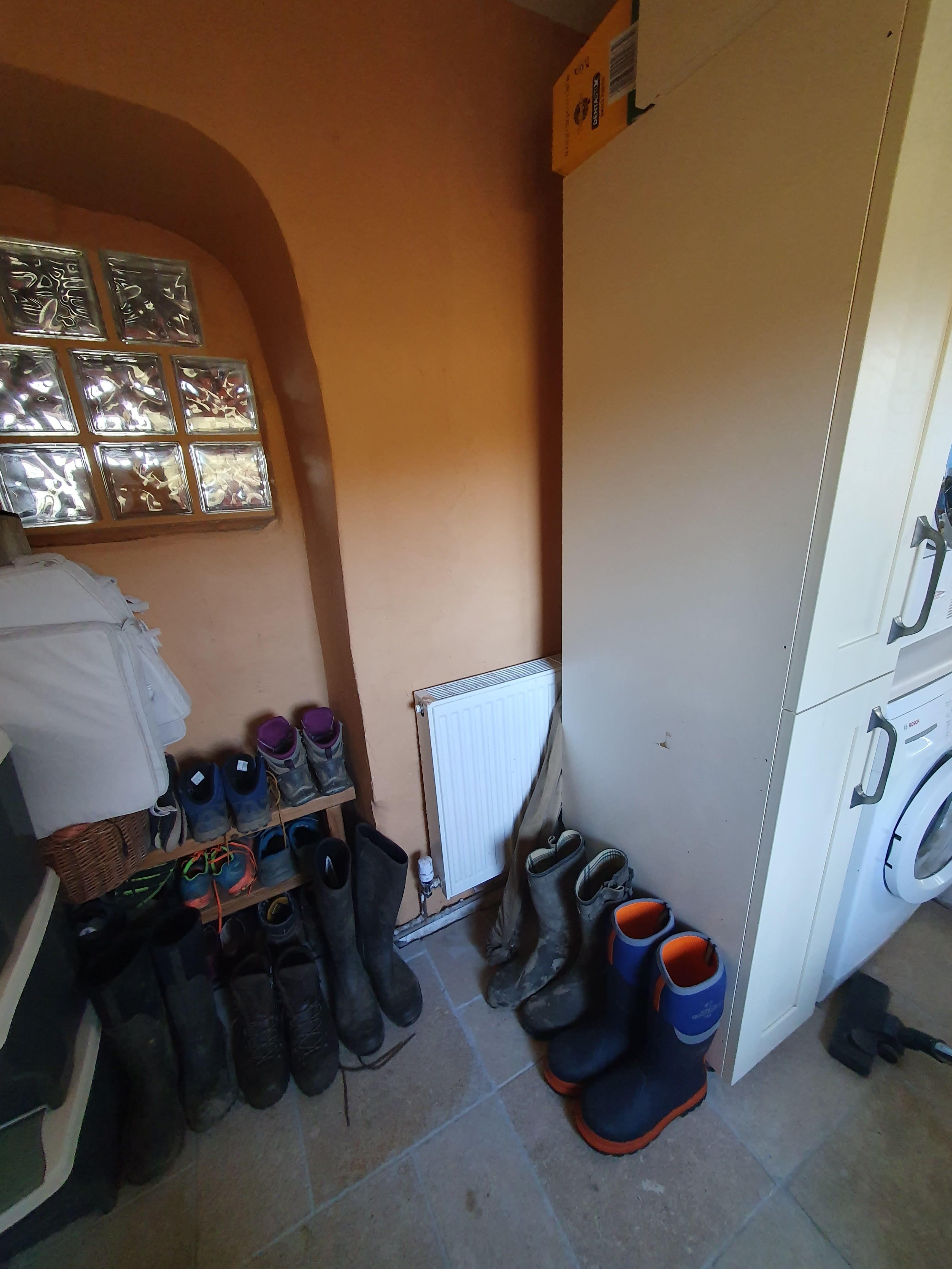 Mostly we wanted somewhere to store our wellies, however building a unit from the radiator to the edge of the units only created storage for two sets of wellies. Pondering on it, Chris decided we might as well move the radiator, as it wasn’t in a great place anyway, being stuck behind the cupboards. With that moved we could build storage wide enough for three pairs of wellies.
