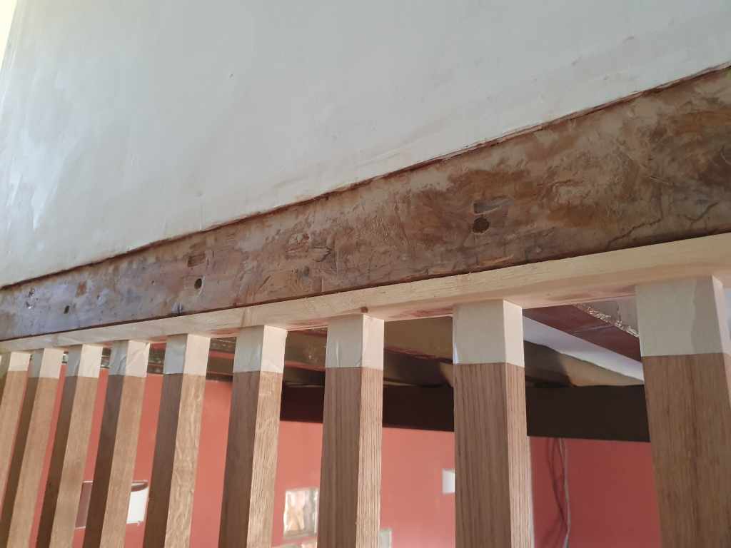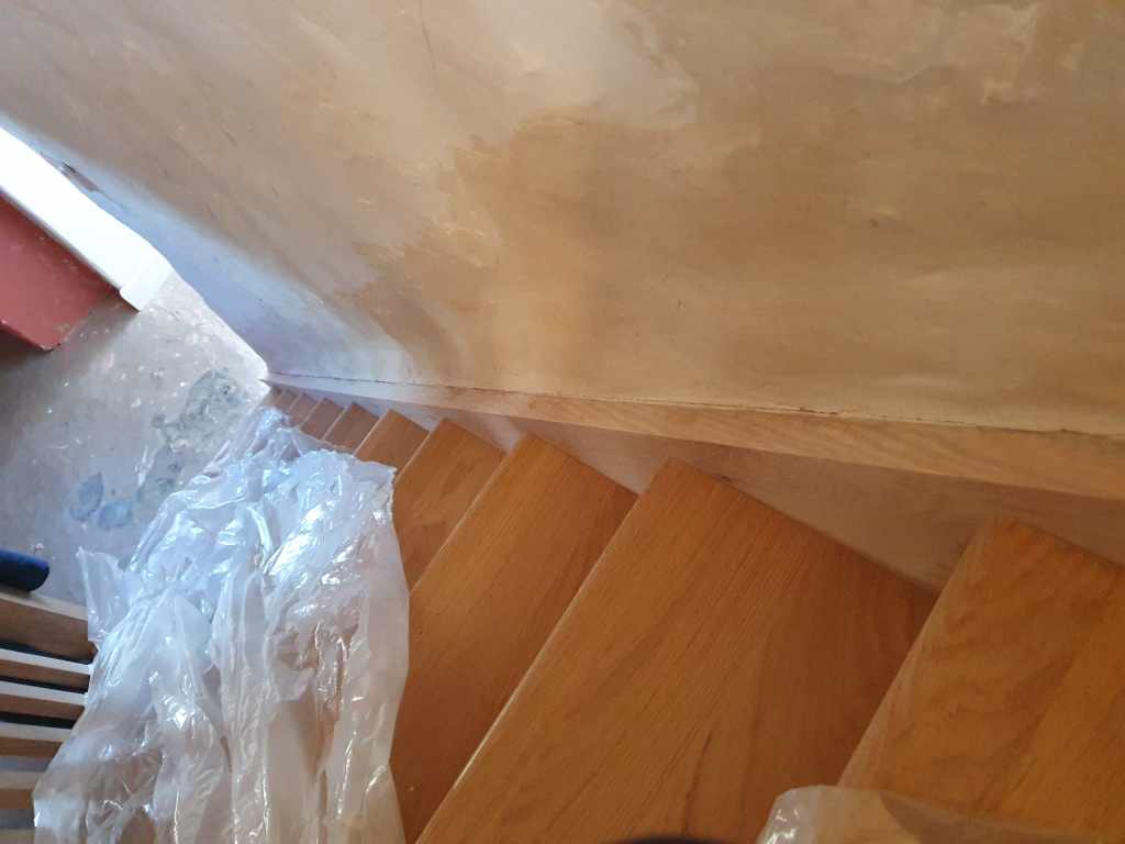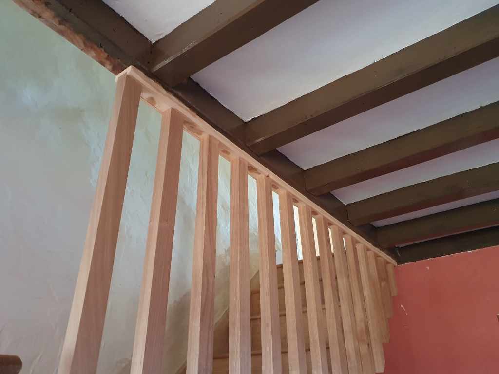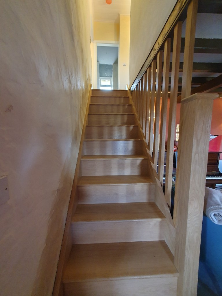 And on the stairs themselves, I stained and sanded the spindles and the edge closest to the wall. We’d been debating whether to paint this edge the same colour as the wall, given there’s some staining from the lime plaster, but in the end we decided it wasn’t very visible.