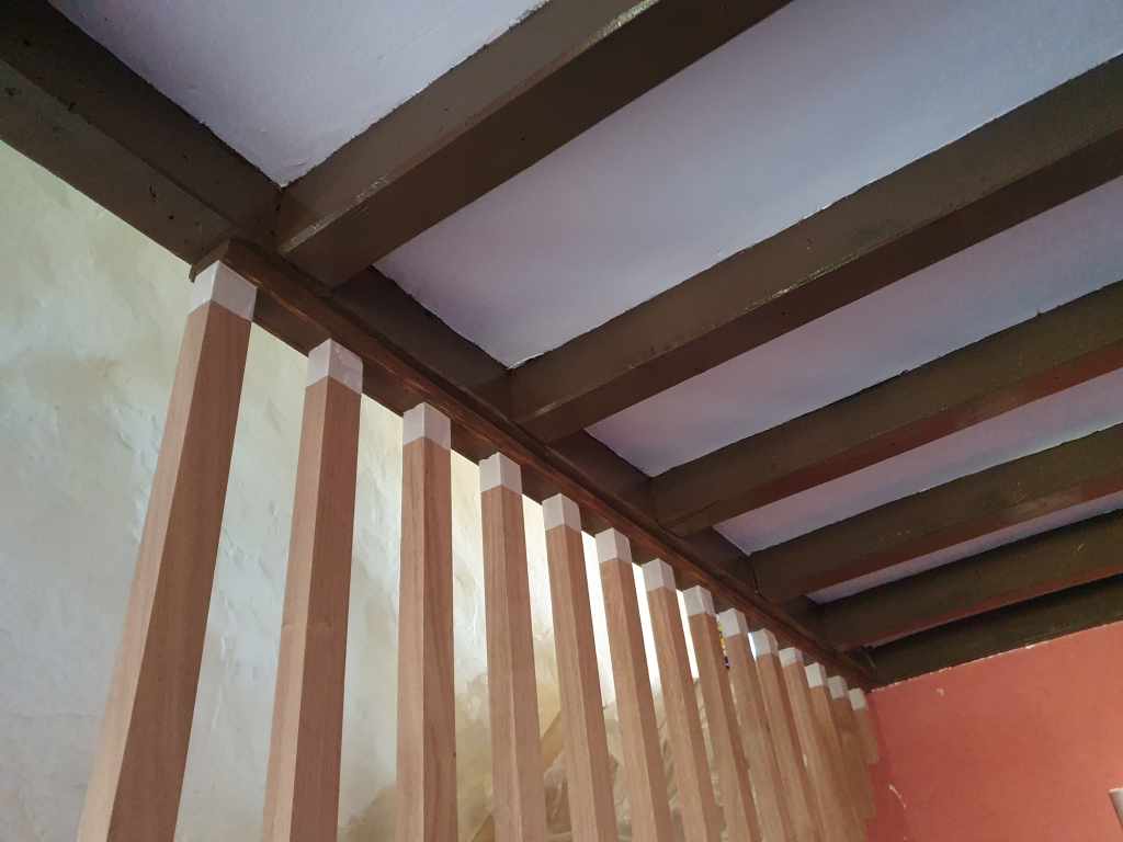 On the stairs I filled, sanded and painted the wood above the spindles. I was sad to cover over the original wood colour, but in order to fit in with the lounge it all had to be brown.