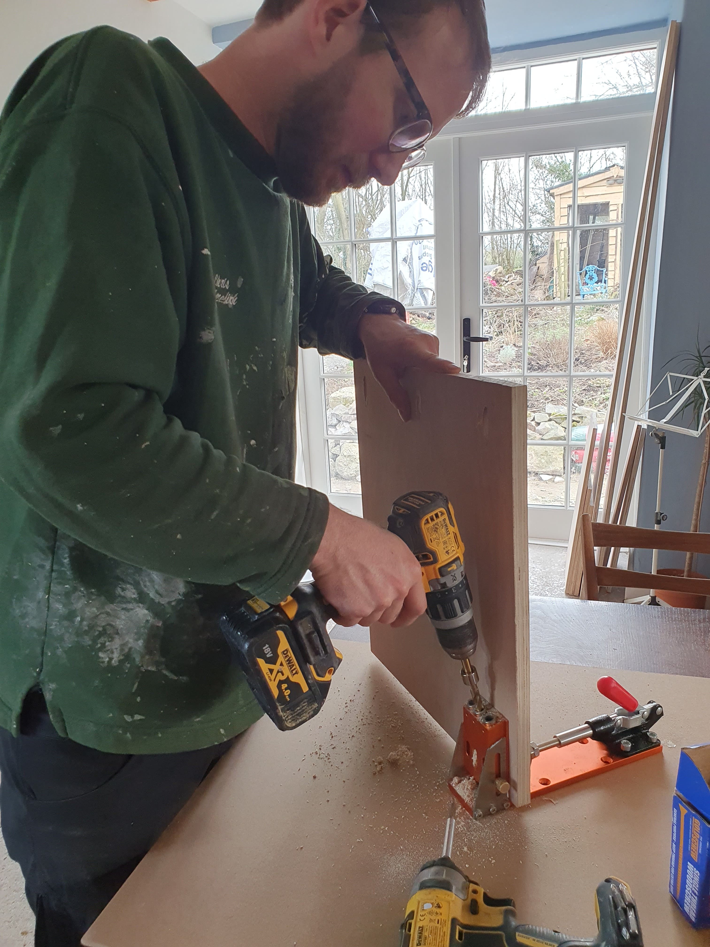 After his very successful evening, Chris spent a frustrating day trying to sort out the sliding draws under the bookshelf. While everything seems to come together fine, the draws keep sticking or pulling away from their runners. Chris assumes it’s something to do with the runners not being completely straight, but after hours of fiddling he’s at a loss and very frustrated. Worst comes to worst I keep telling him we can put in shelves, but he’s determined to get there in the end.