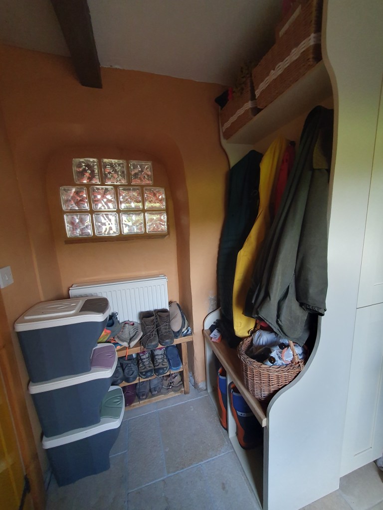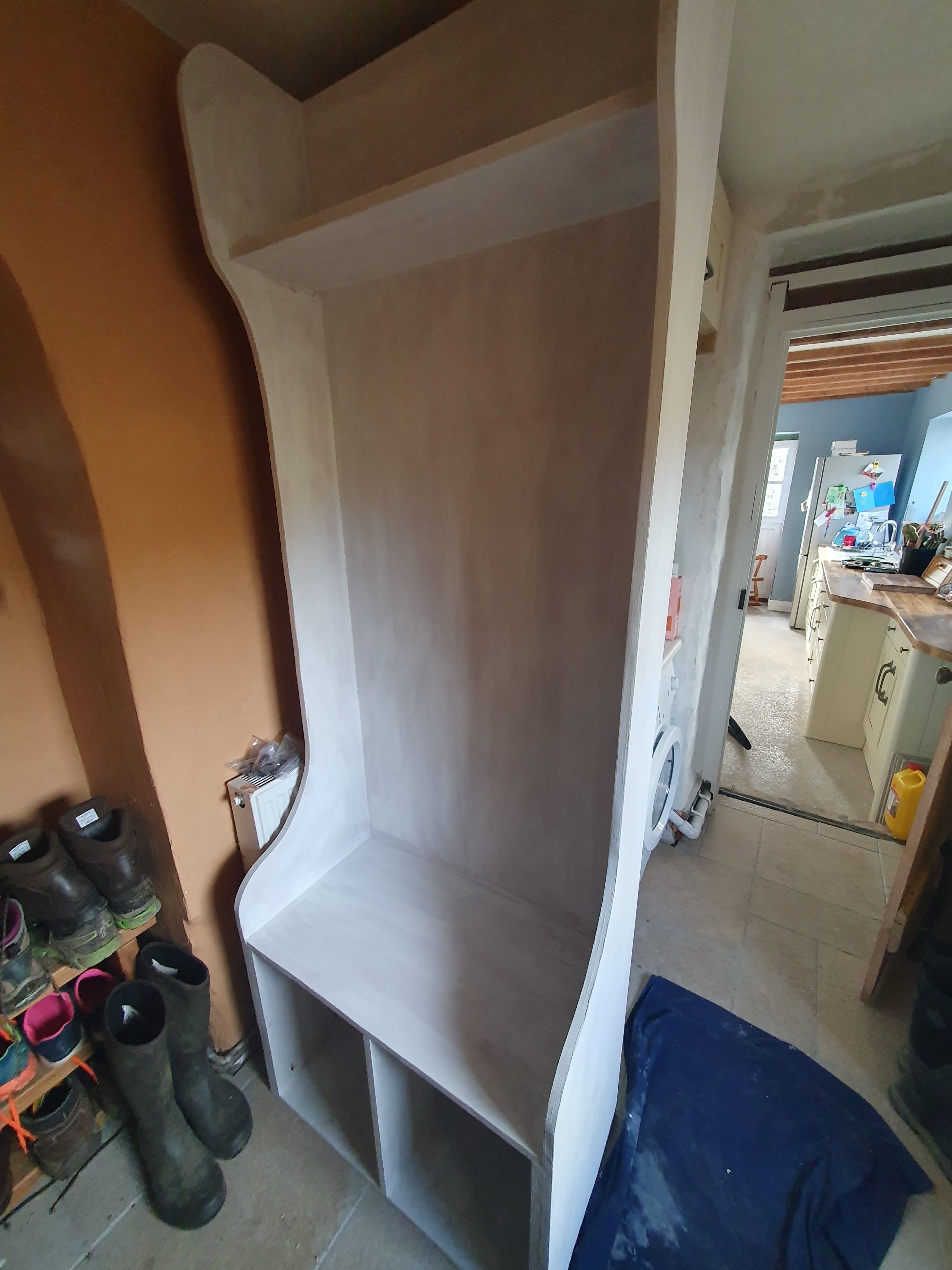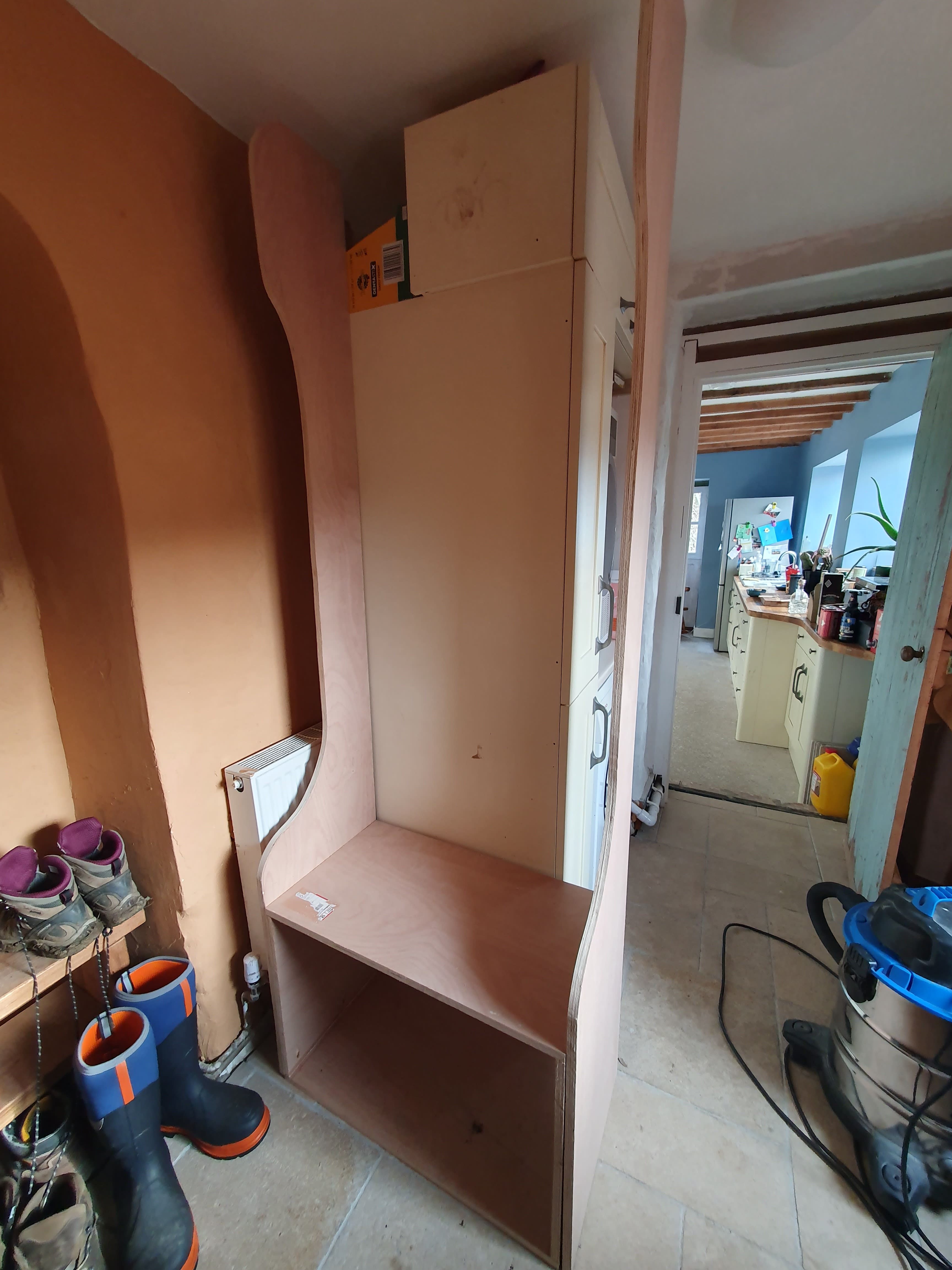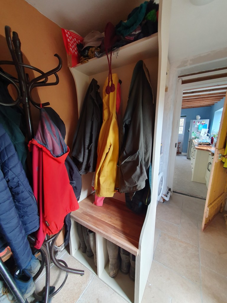 I headed to B&Q with a sample of our cupboard colour, and got a paint match to paint the coat rack. I then added hooks and Chris cut and routered a worktop piece for the bench. Chris also managed to pick up a second-hand radiator that’s the right size, so we’re good to go on moving the radiator so the coat rack can shift across.