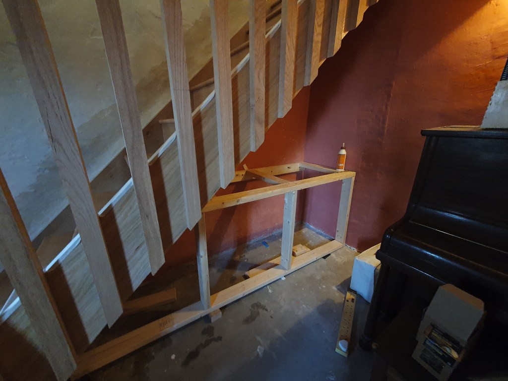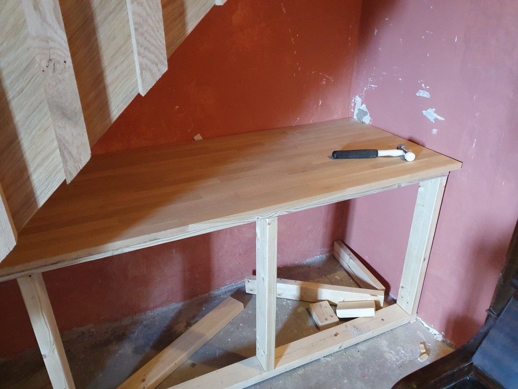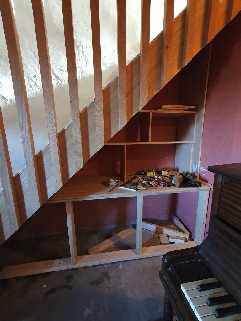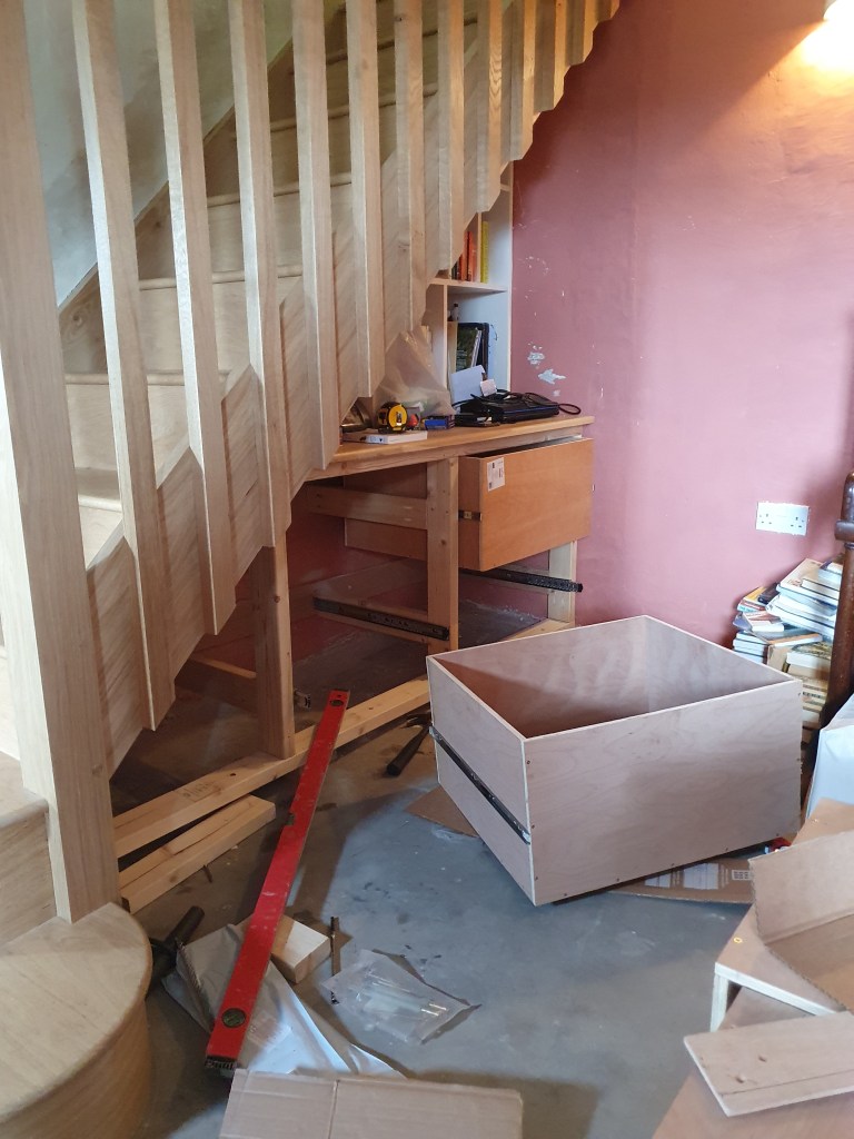 The next bit of construction was to start on the storage under the stairs, a set of pull out draws with a bookshelf on top. Chris and I worked together on the base, before he headed to work and I messed around getting the worktop and the bookshelves in.