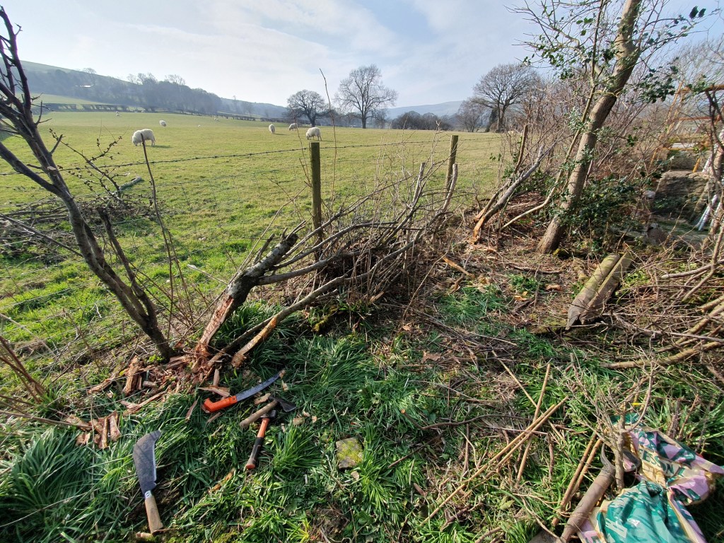 It was a fiddly bit of ground to work on, being high and narrow. I managed to cut out the old fencing before starting to lay the trees. There were fewer than the other stretch, and they were much thinner, making it a quicker job. One of the coppiced hazels we decided not to lay, as it sit lower down and will need to come out when we repair the wall.