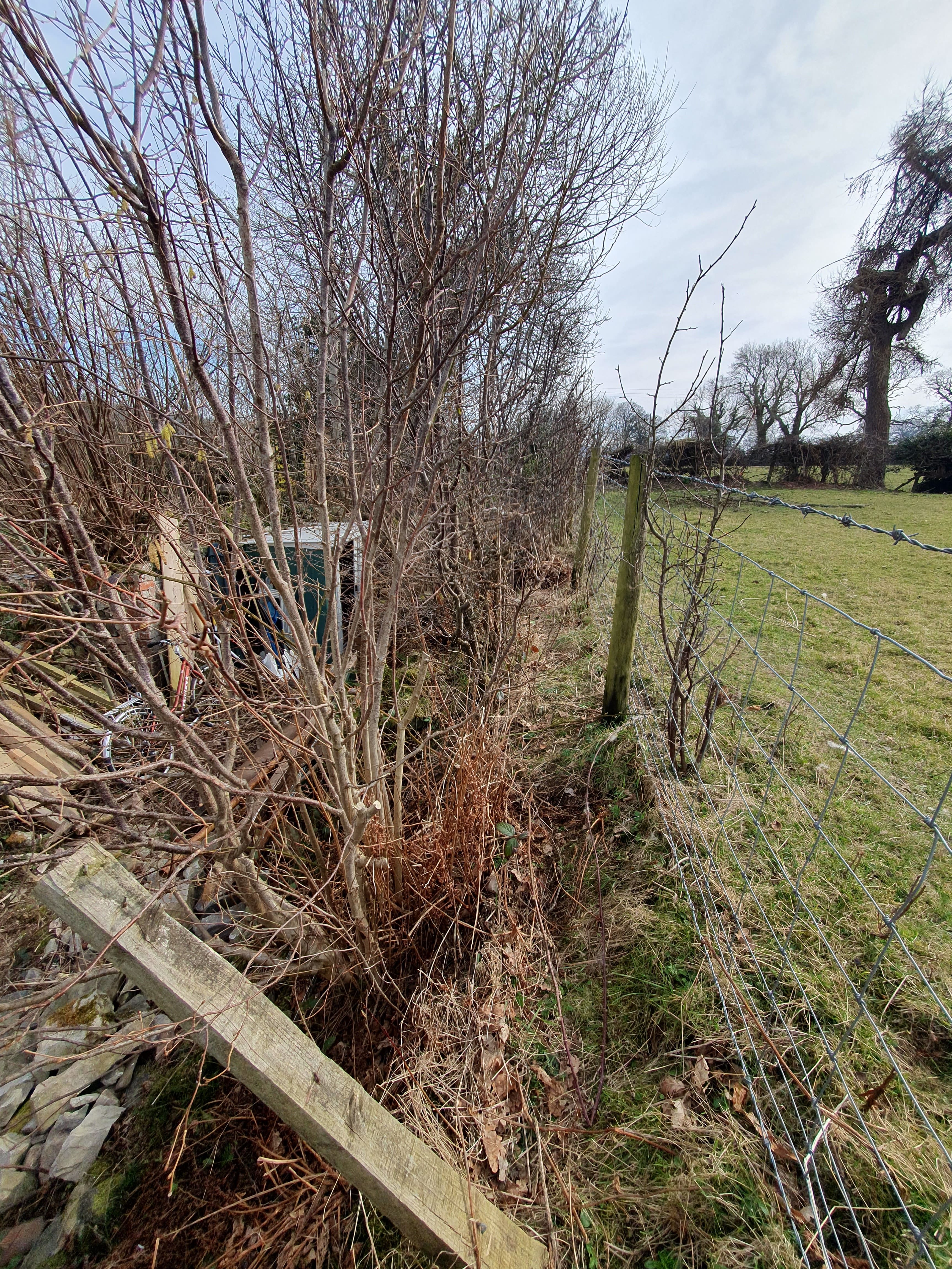 There was a scratty bit of hedging alongside the car parking space. To rejuvenate it, we laid the remaining hedge plants and filled in the gaps with new whips.