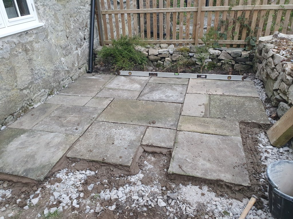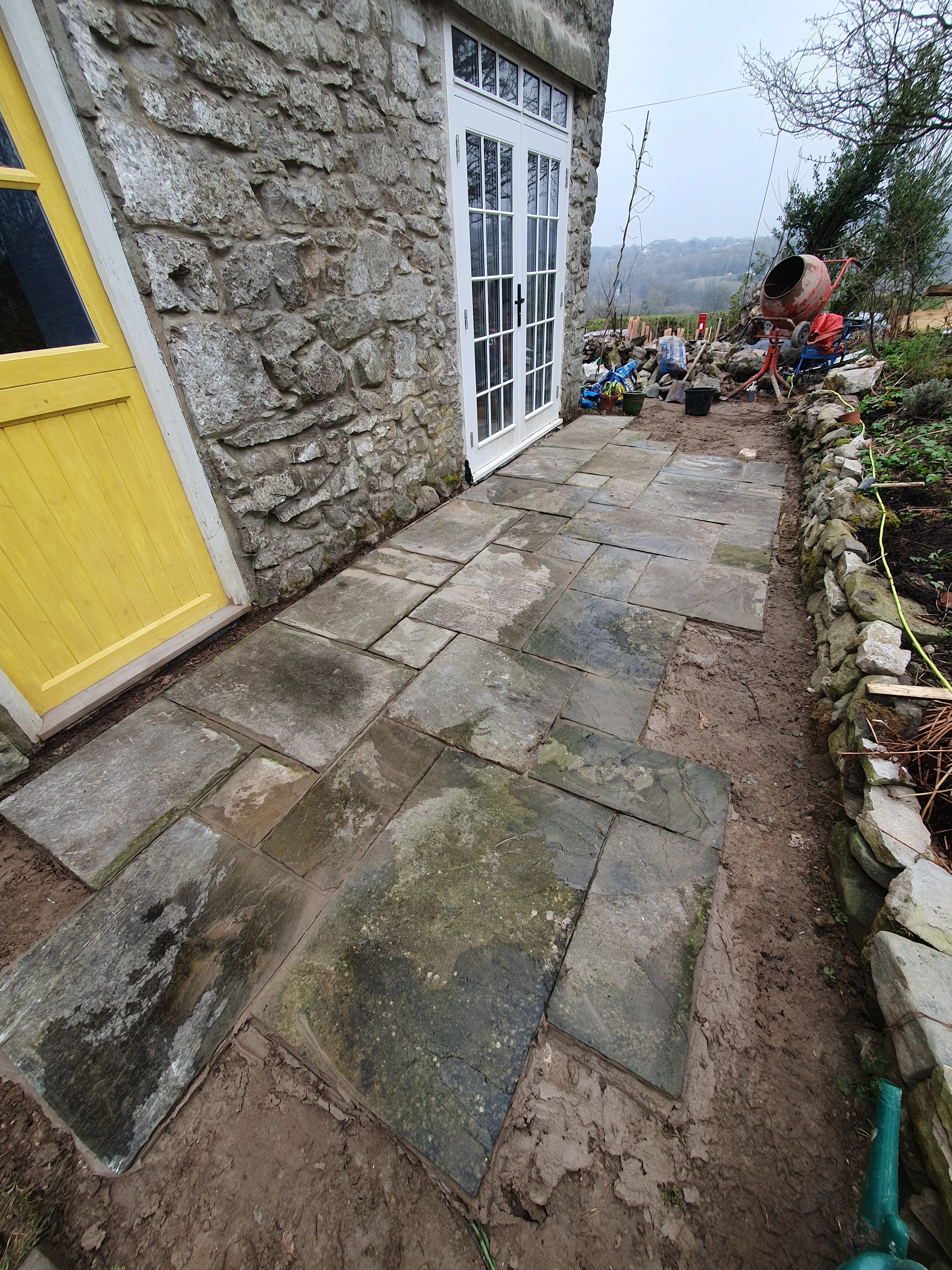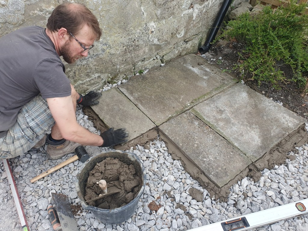 We then moved to the front patio. Originally we thought we could do the same as the side and put the slabs straight down, but the ground was too soft. Chris spent a morning wheelbarrowing up gravel and tamping it down.