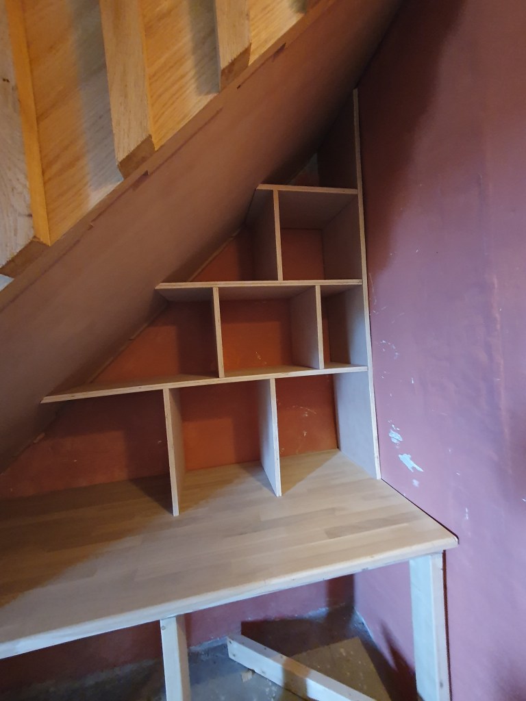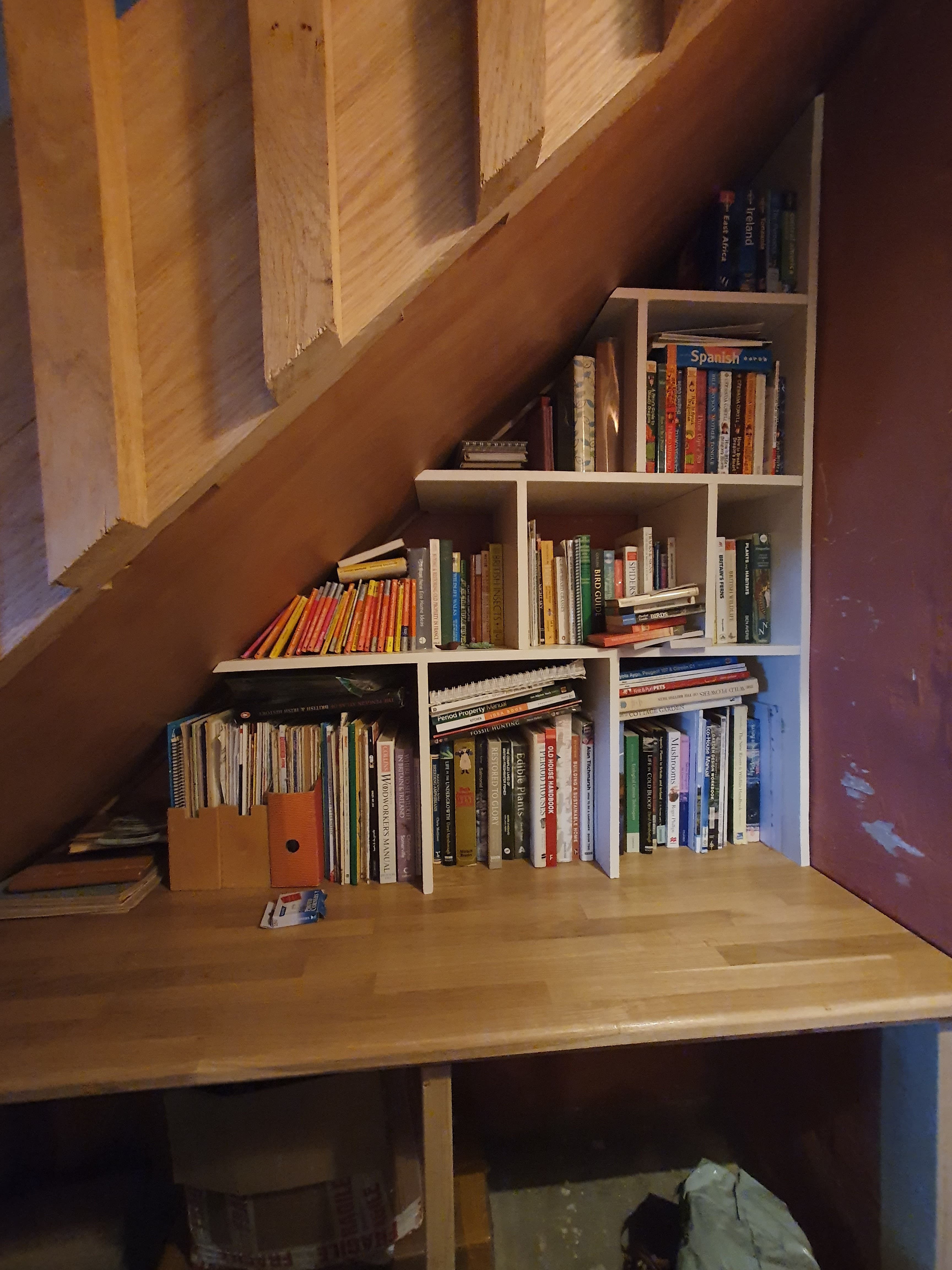 I then spent a long day cutting and fiddling with the cupboard shelves so they fit. With wonky walls and wonky stairs it was a real pain to get it all to match up. But it’s finally all in and just needs painting so we can stack the books that have sat in boxes for two years.