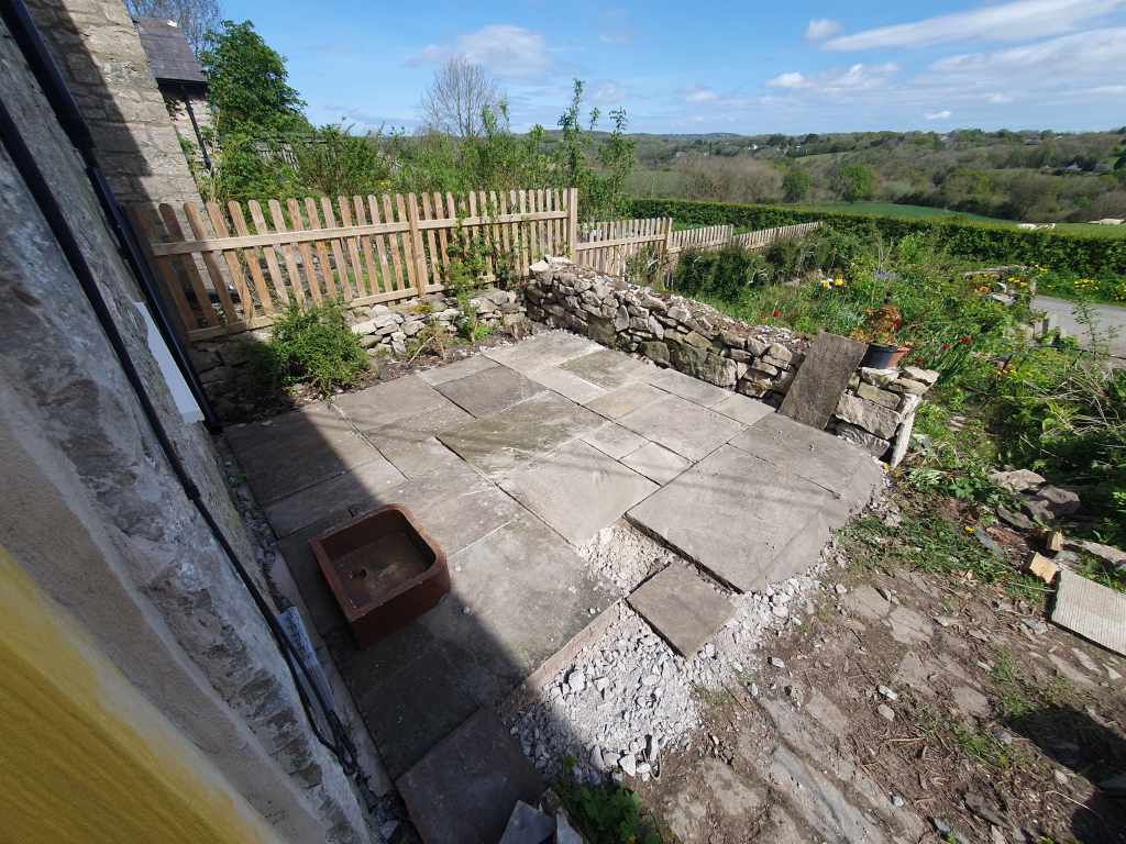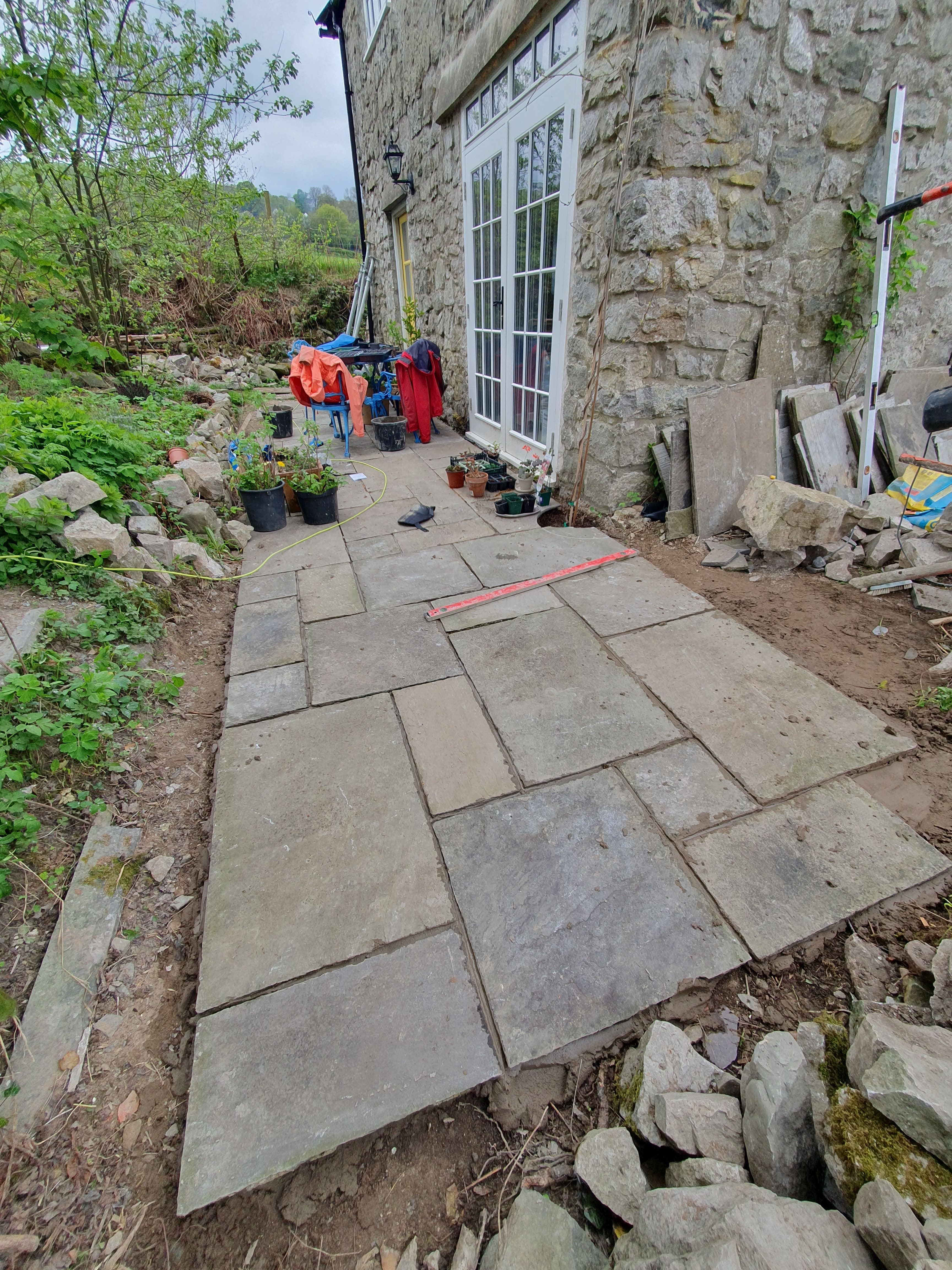 Our big exhausting job was finishing off the two patios. To do this we first had to shift a pile of rocks (again after already having moved them twice). There is a little bit left to do at the back of the house but as we need to rebuild the bank wall, we decided we’d wait till this was done. We also need to lay a connecting path between the two patios, which we originally thought we’d do in the same slabs, but it’s far too winding for big slabs to be practical so we’ll think of something else.