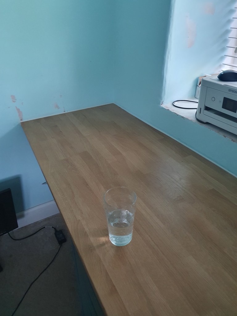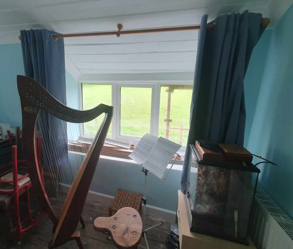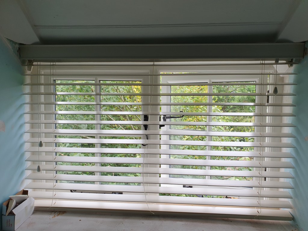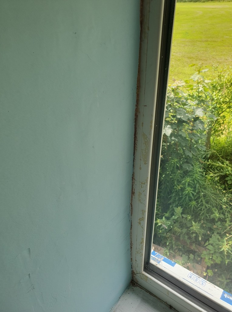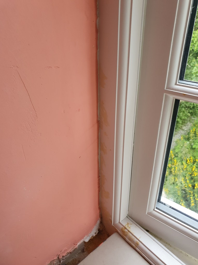Chris ordered a blind for the study to keep the sun out of his eyes. It was a struggle to get in, with the wonky walls making it a tight fit. He then filled along the edges.