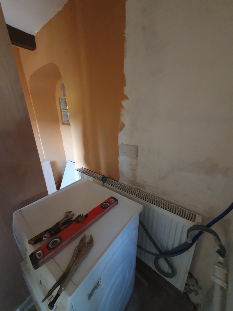 In the utility the only wall long enough for the radiator was the same wall all our cupboards had to go along. The room is always very warm so Chris decided we could get away with shrinking the radiator and moving it to the recess of the old doorway. This would stop heat getting trapped behind the cupboards and let us put the new coat rack against the wall. Chris was lucky enough to find exactly the right sized radiator secondhand on marketplace.