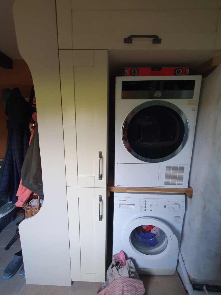 It was a long job, largely because we had to empty all the cupboards, move them out of the way and take out the washer and drier. It did however also allow Chris to replace the old worktop the dryer sits on. When Chris previously installed it he realised he cut it too short meaning the top cupboard overhung the rest. He managed to use some offcuts of the kitchen worktop to make a matching surface.