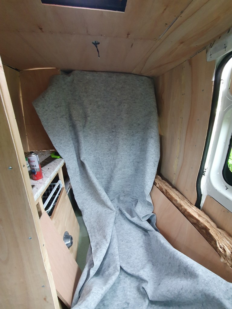 First we installed a carpet…on the ceiling. This ‘van carpet’, is often used to line vans, and is a kind of felted material that you attach with a sprayable glue. Having decided the ceiling was a little messy, with all the gaps and joins, this seemed like an easy solution. It was wonderfully easy to install, so I’m not surprised it’s an option many people go for.
