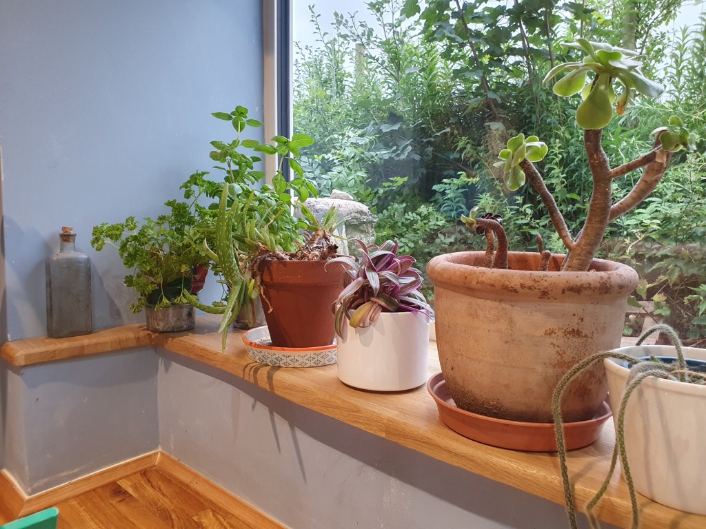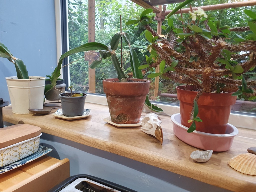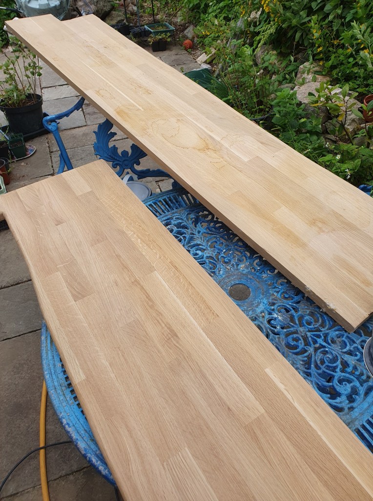 Having cut out the kitchen windowsills, I didn’t get round to treating them, and with a few accidental spillages while watering, they started to get marked. To save them I sanded them back down and applied some varnish. It was a relief to see they cleaned up OK. Chris then installed them.