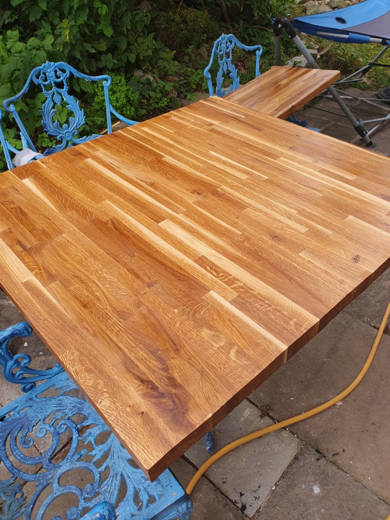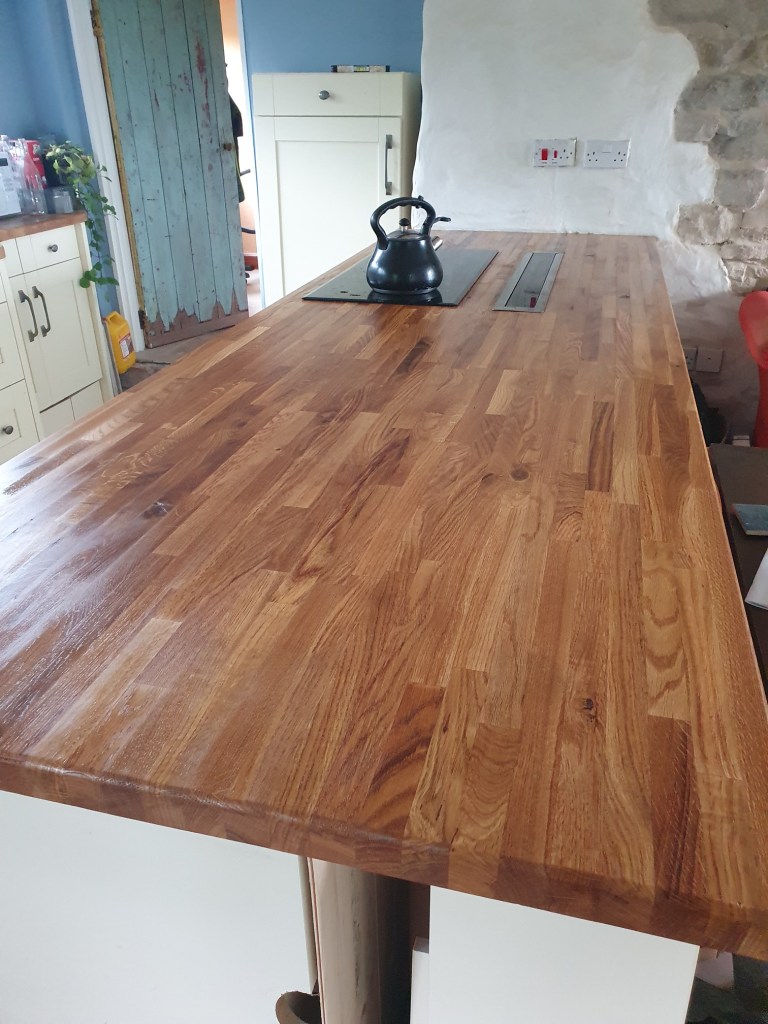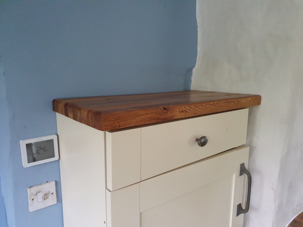 Alongside the worktops, Chris shaped and treated a top for one of our cupboards from a leftover piece of worktop.