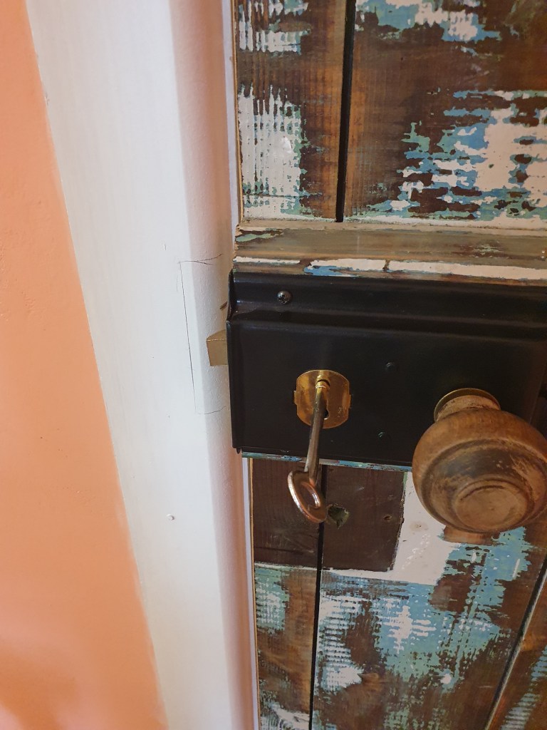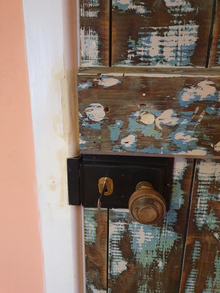 In the bedroom I drilled and chiseled out a section of the frame to put in the catch for the lock. Unfortunately, it turned out where Chris had put the lock meant the catch couldn’t be properly attached. So I moved the lock down and refilled the areas I’d previously cut out.