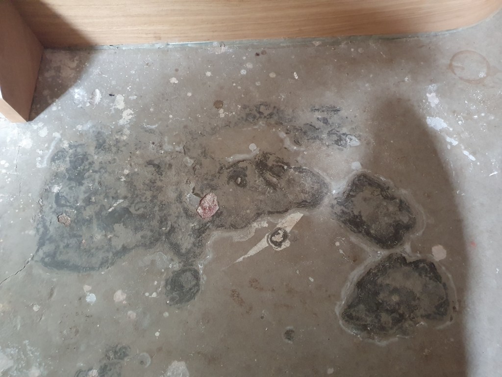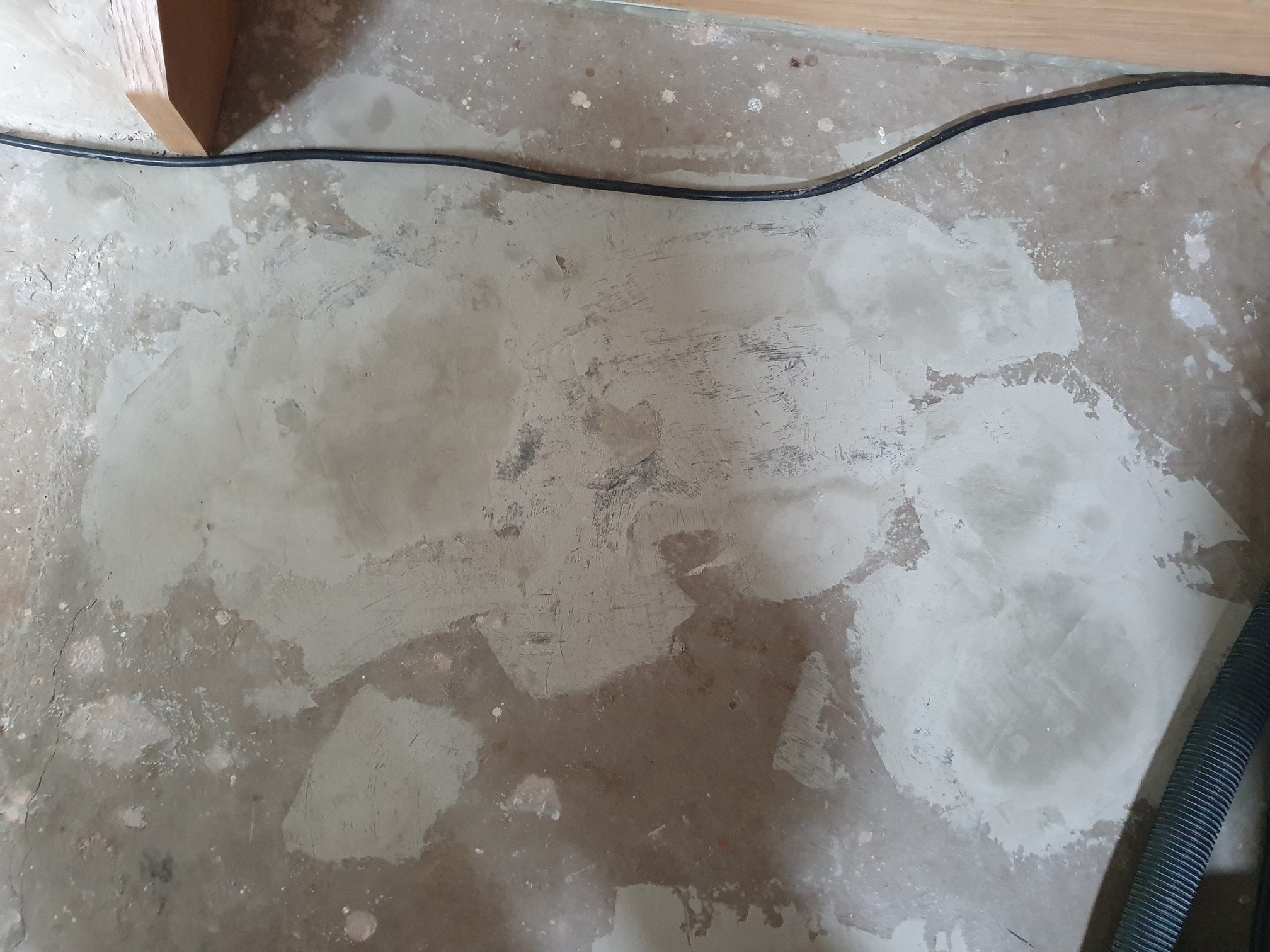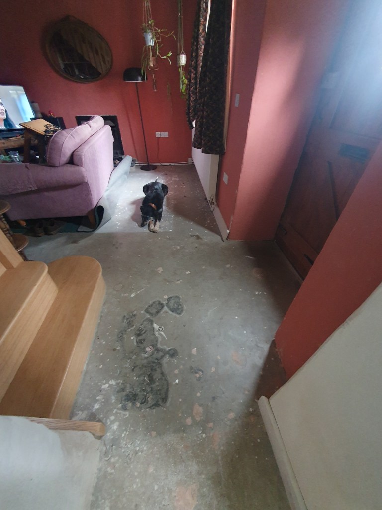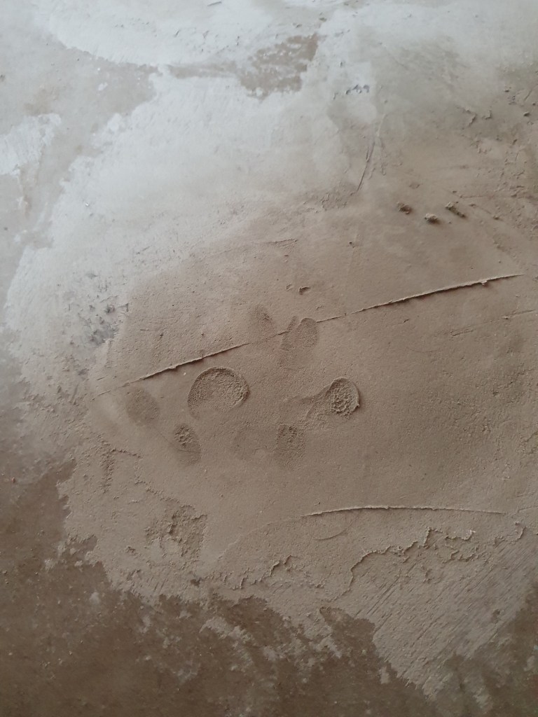 To get ready to install our cork flooring, we needed to clip off the old lumps of plaster, and fill in and holes in the floor leveller. To avoid clearing the room, I shifted furniture to one side and then the other, scrapping and filling. Luckily most of the floor was in fairly good condition, with only a few bad areas. Idris helpfully left his pawprint in some of my concrete filler, which luckily sanded out.