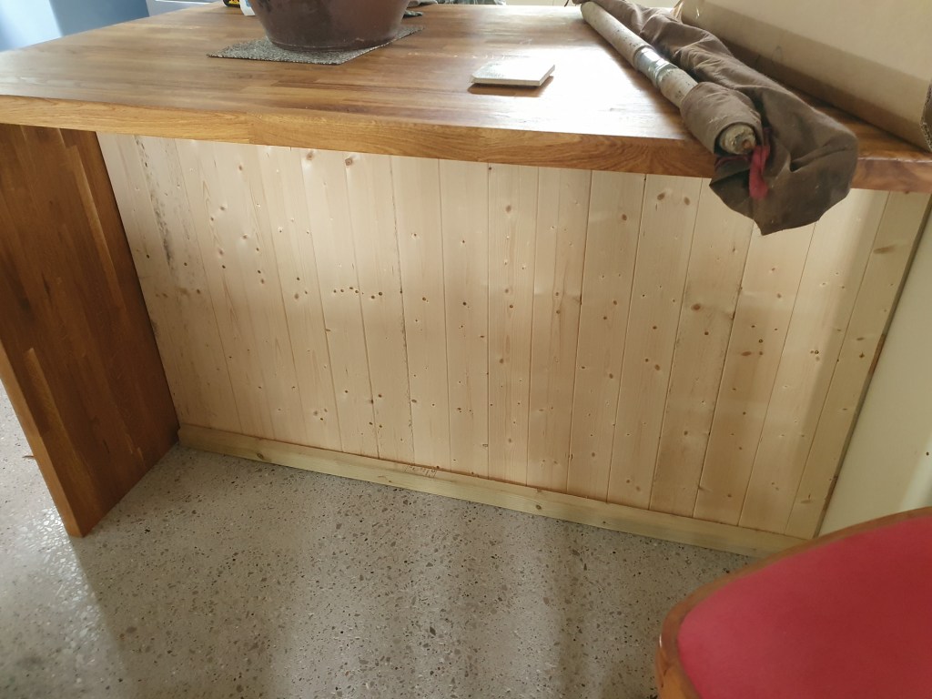 Under the breakfast bar, Chris fixed the final few boards in place and added a trim along the bottom. He then gave it two coats of primer and sealed the edges. Once dry we’ll use the paint we had mixed to match the kitchen cabinets.