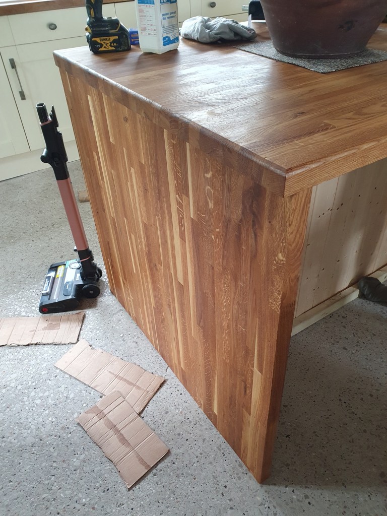 Chris has been keen to treat the kitchen island. While the actual treatment doesn’t take too long, we then can’t use the surface for around a week as it dries. Finally dry, he attached the side properly and sealed the sides.