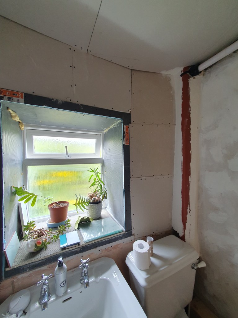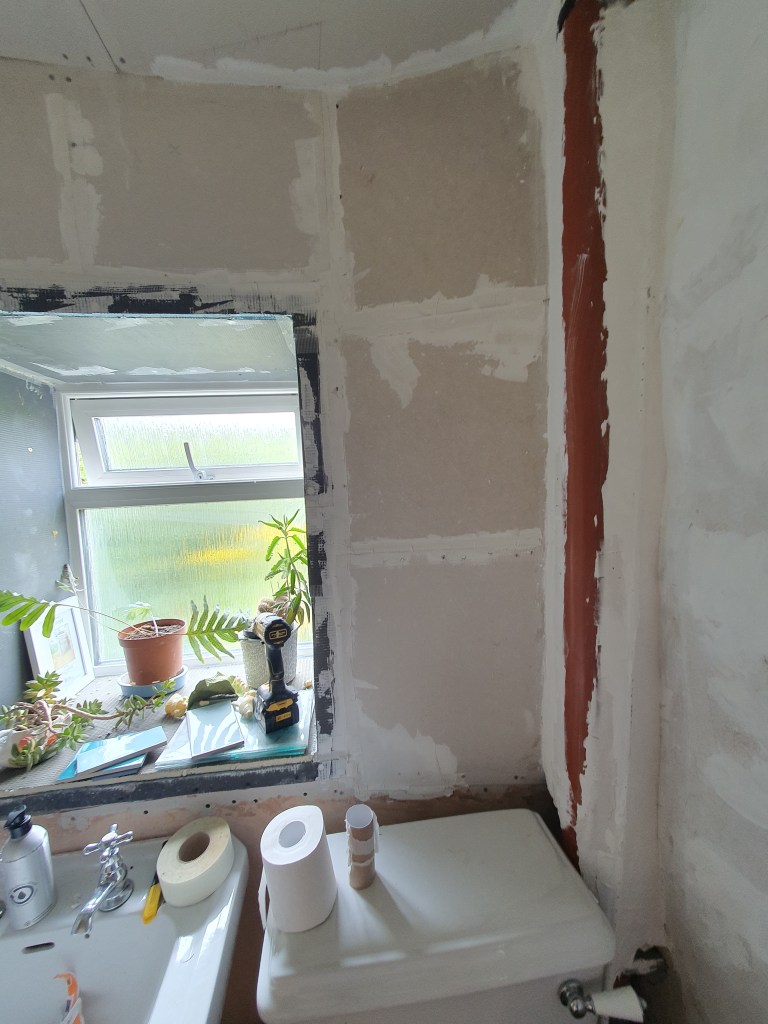 We’ve both been avoiding plastering the downstairs bathroom, as though it’s small, the tight space and odd angles will make it a pain to do. Still getting near the end of your list means working on the more annoying jobs.