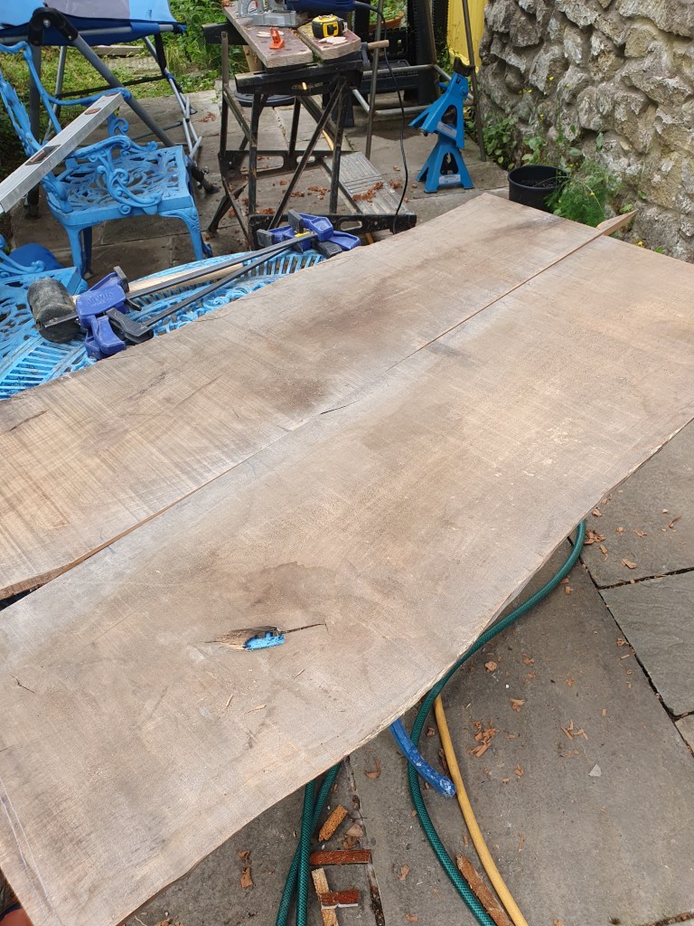 Finally, with some energy back myself, I took over on the Windowsill at the weekend. Cutting it to size using my template and then spending an age sanding it. Chris was keen to keep the wavy natural edge.