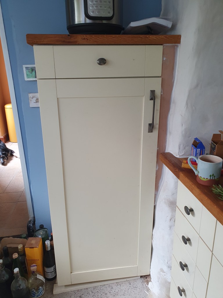 In the kitchen, Chris attached the top to the cupboard, and decided to cut a panel to fill the side, which is a reservoir for dust and spiderwebs. Once painted with the matching paint it should disappear.