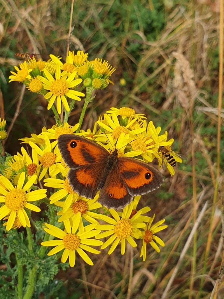 Out in the garden it’s nearly time to cut back our mini-meadow, so I spent some time chopping down the ragwort. Ragwort has a terrible reputation, which is entirely undeserved, and is brilliant for a wide range of invertebrates. But, it does like to spread, so while I’m very happy to have it flowering in the meadow, I’m cutting it back before it seeds to prevent it crowding out the other plants. The good news is some new wildflowers have appeared, including self-heal, bird’s-foot-trefoil, cut-leaved cranesbill and yarrow, so hopefully this is a sign the meadow will continue to improve with management. There’s also a lot of young scrub, which I’ll have to get on top of in the winter.