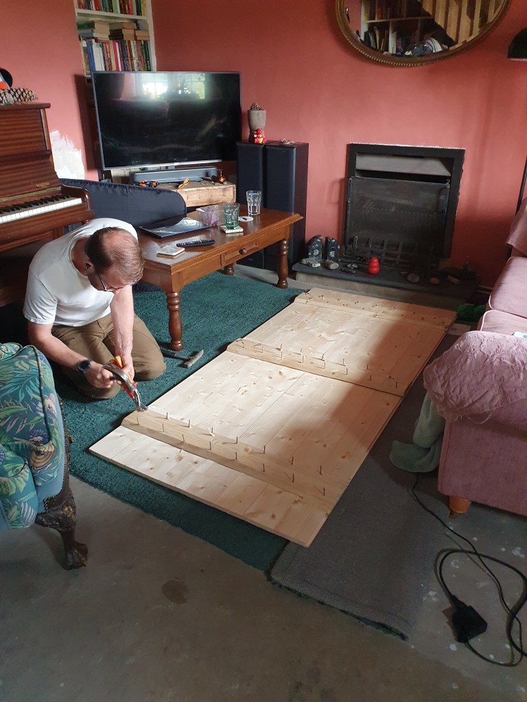 I, unfortunately, didn’t get many photos of the door coming together as I was curled up on the sofa, however, I think Chris rather regretted opting for the traditional technique of using long nails and bending them back round into the wood to pull everything tight. Traditional but a pain.