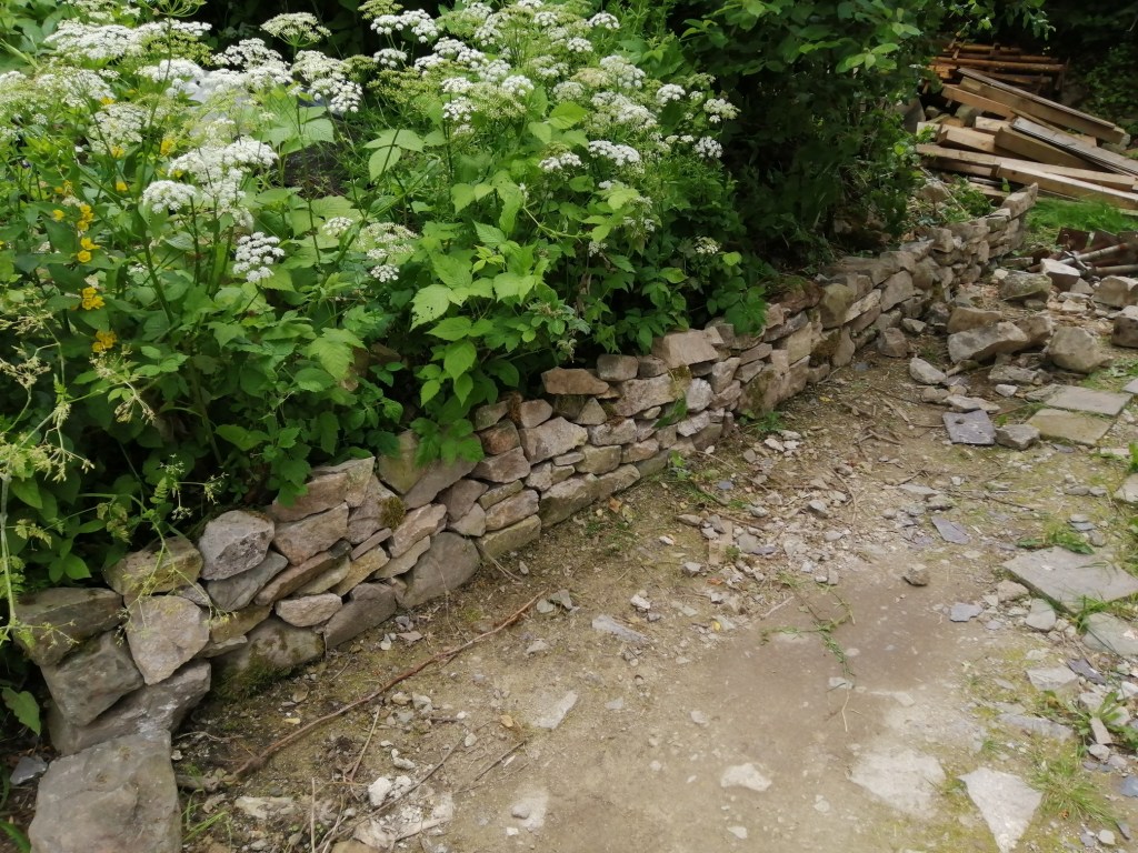 I’ve had quite a long break from drystone walling, but after a particularly irritating teams meeting I got out in the garden to build some more, my own bit of meditation. It’s a bit of a unstable wall at the moment as I need to backfill in a number of the places, having built the wall straight when the earth bank isn’t.