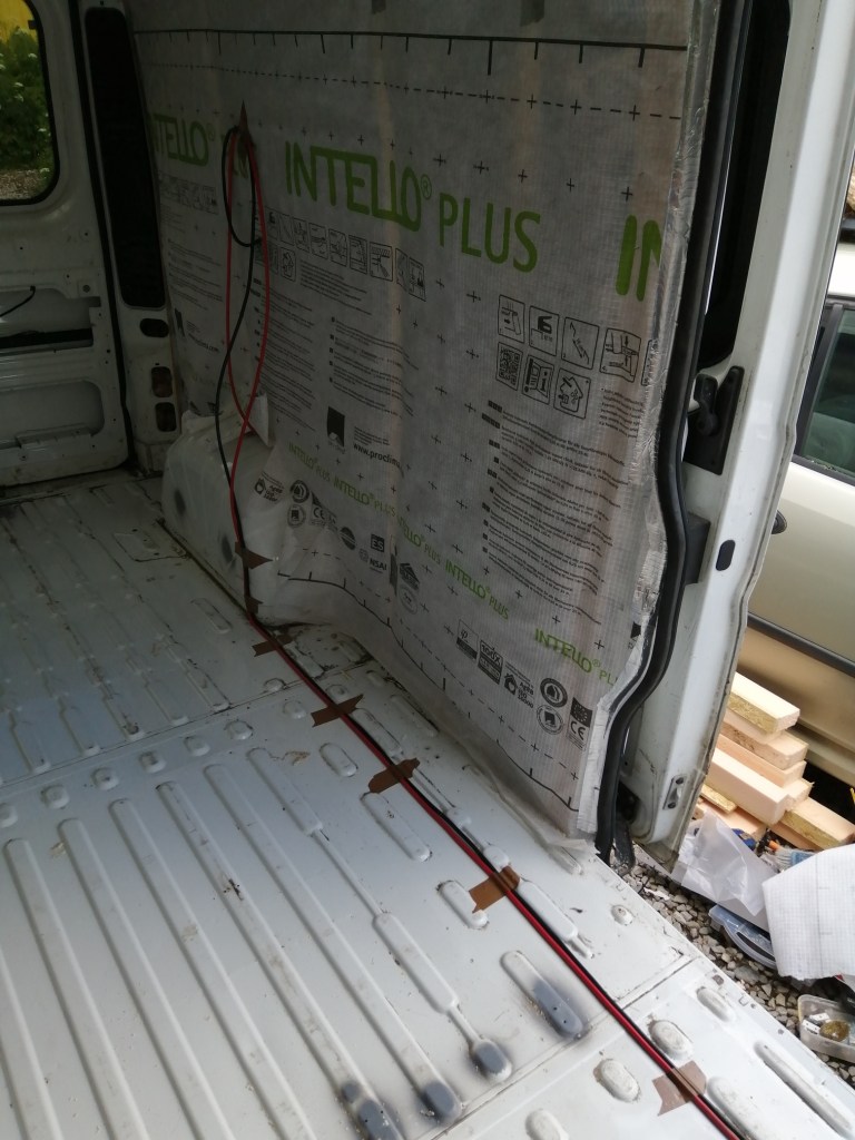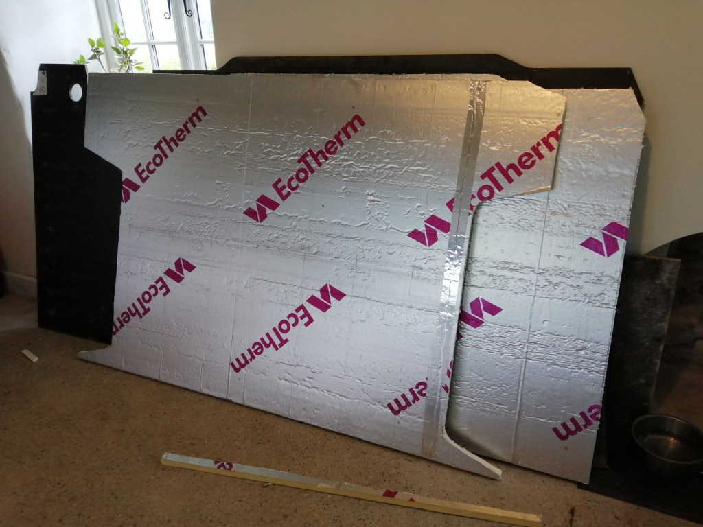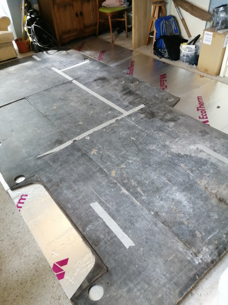 The solid flooring now put back down, and screwed into place through the old screw holes, I had to pack insulation around the wheel arches and tape to tops to the wall to seal. An awkward present to wrap.