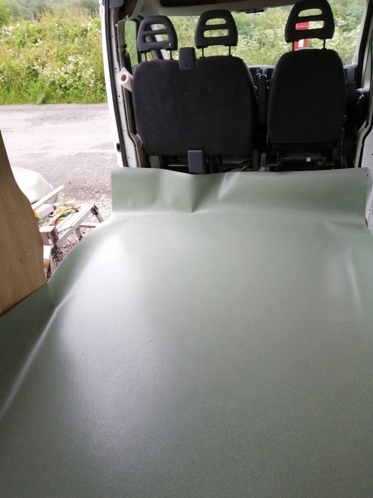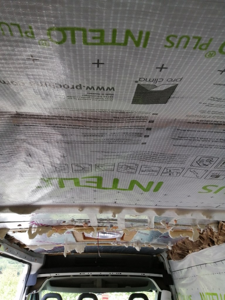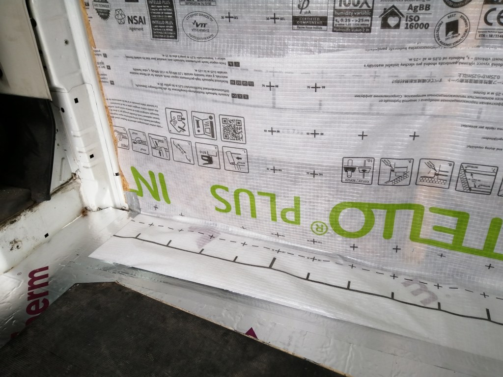 I then cut and attached additional vapour membrane where it was missing. The vapour membrane was then taped to the floor and membrane added over the wheel arches.