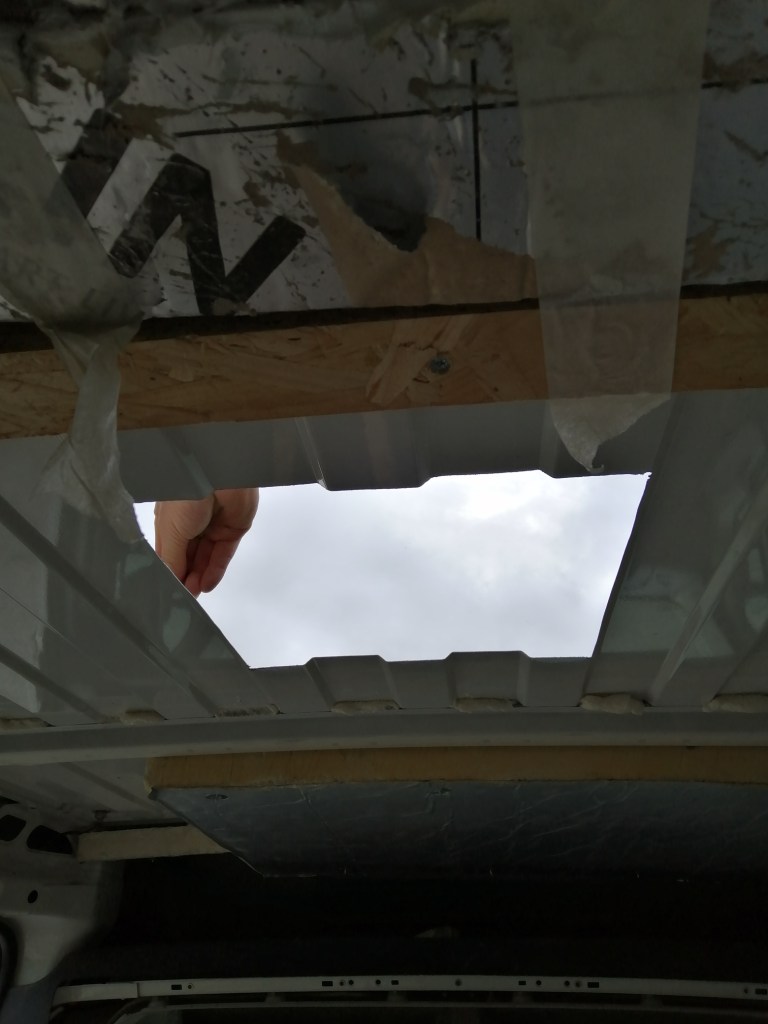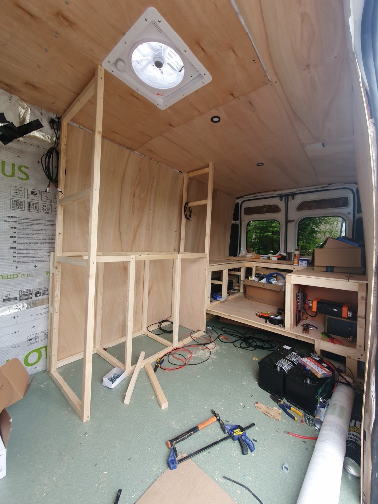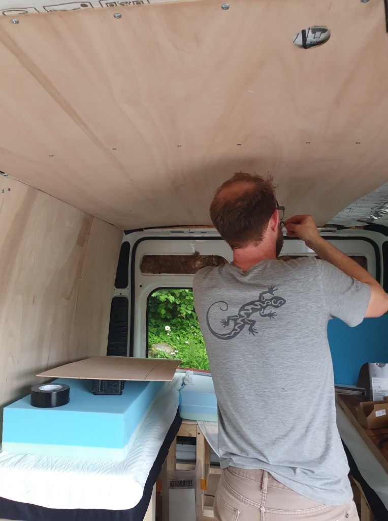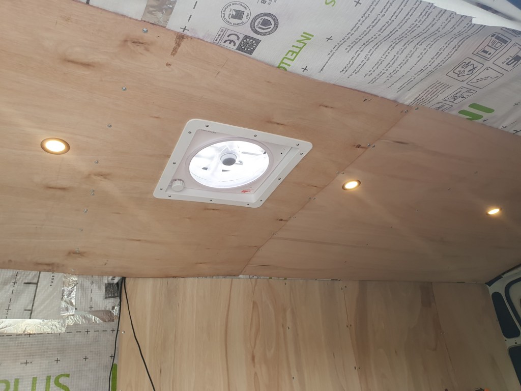 On the weekend myself and Chris focused on the van, with Chris working his way through the electrics, while I cut the awkward pieces for the roof. It was exciting to have the lights and the fan finally working.