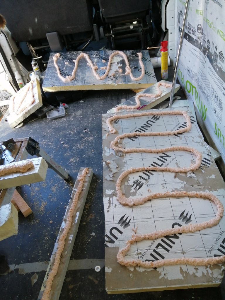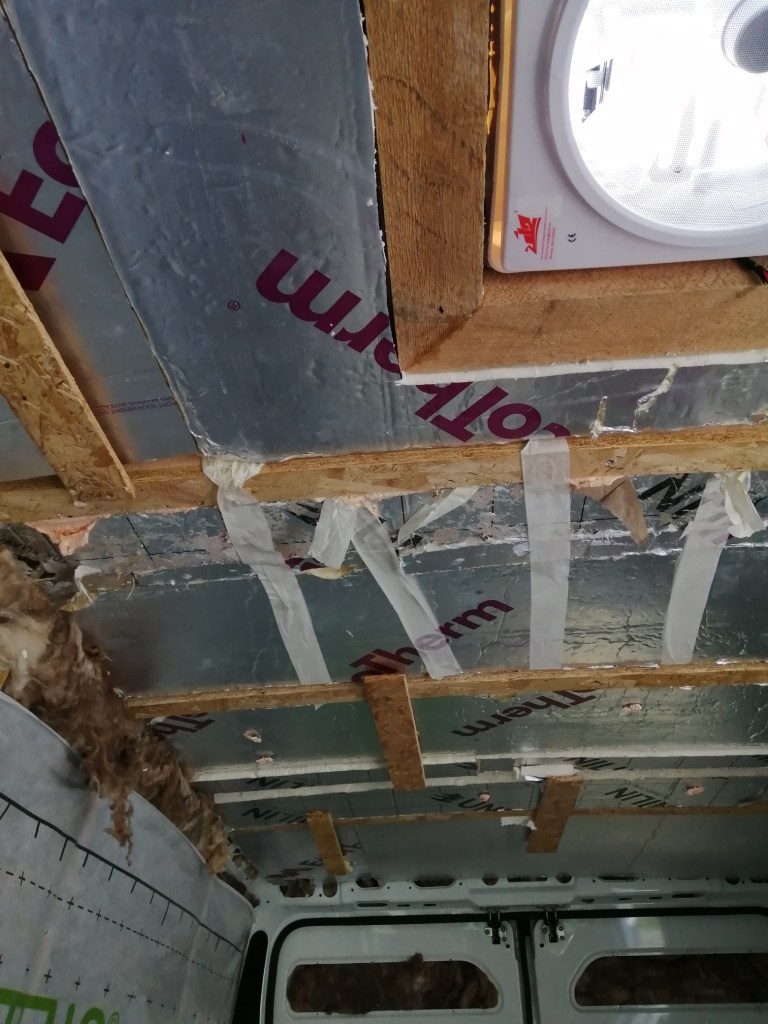 Sticking the insulation on the ceiling was a pain. Even though Chris had brought special attachments to make it easier, the glue kept failing and the boards were constantly falling down.